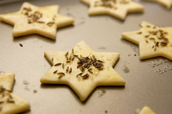Na pomoučněné pracovní desce rozválejte 3 mm placku, ze které vykrajujte tvary nebo tyčinky. Tvary rozložte na nepřilnavý pečící plech a potřete rozšlehaným vajíčkem. Troubu rozehřejte na 190-200°C a pečte do zlatohněda. Pokud raději zvolíte variantu tyčinek, postup je úplně stejný. Těsto vykrajujte rádýlkem, potřete vajíčkem a posypejte solí a kmínem.