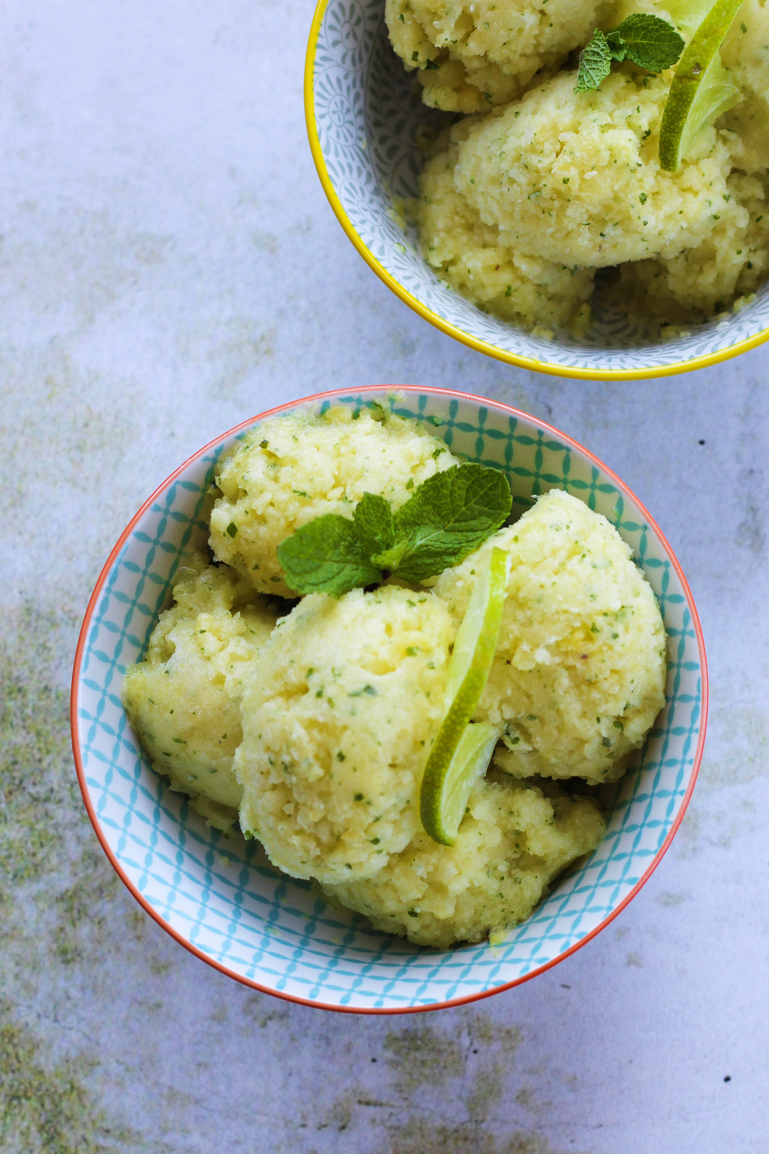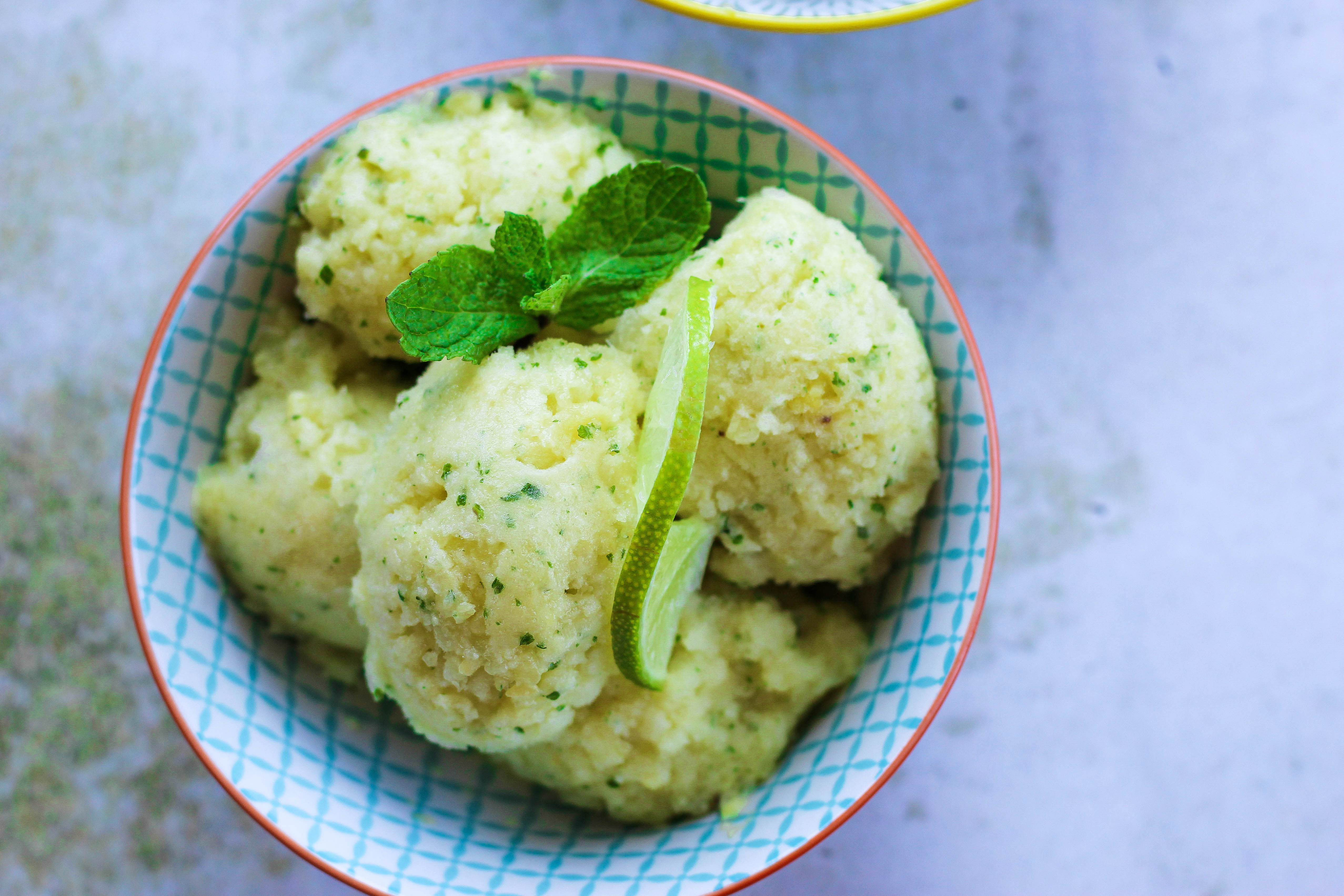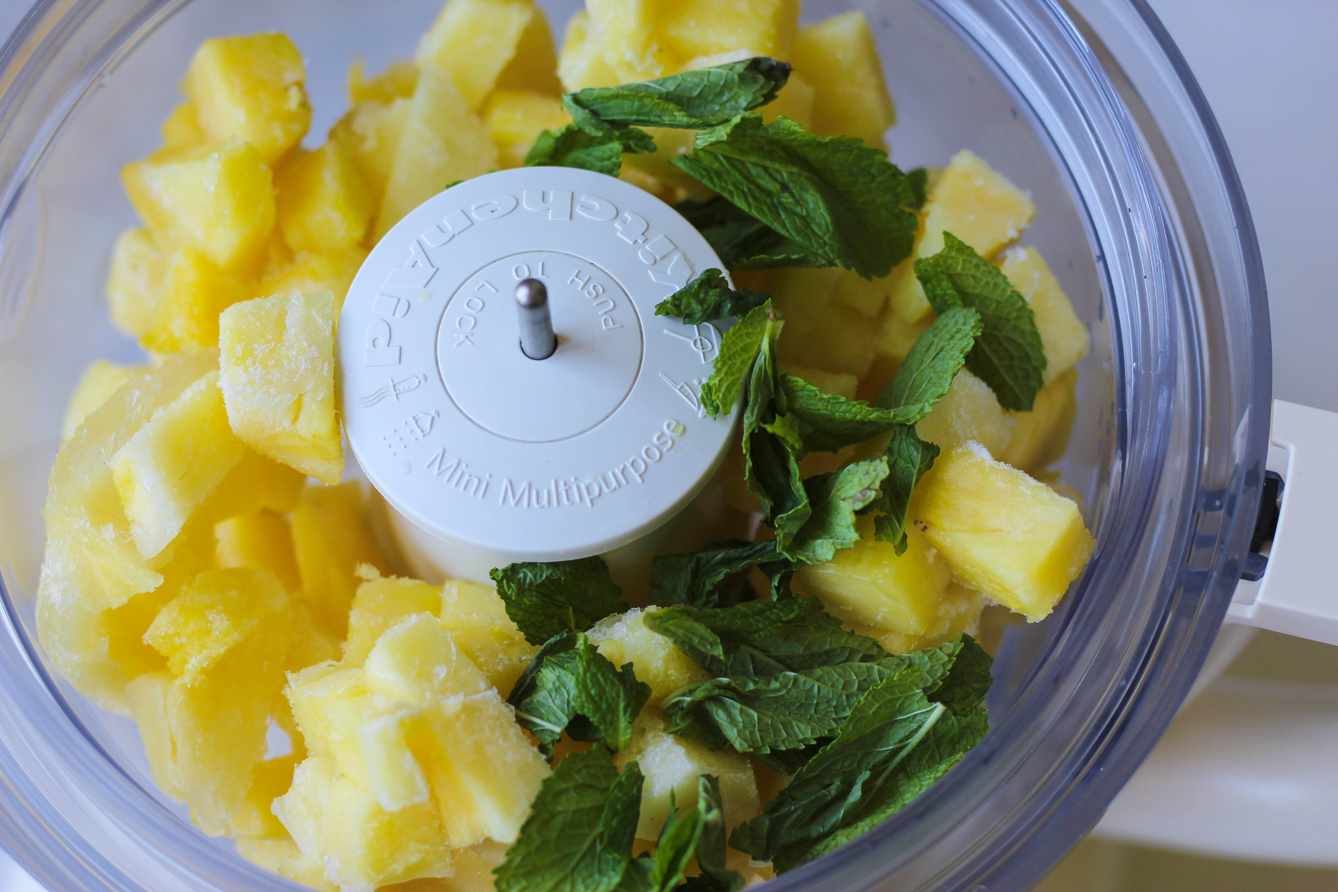 Ananas oloupejte a nakrájejte ho na menší kostičky. Ananasové kostičky přendejte do uzavíratelné misky, vložte ji do mrazáku a nechte ji tam nejlépe přes noc. Druhý den vhoďte zmrzlý ananas do food processoru nebo mixéru, přidejte šťávu z jedné limetky, hrst máty a vše rozmixujte.
