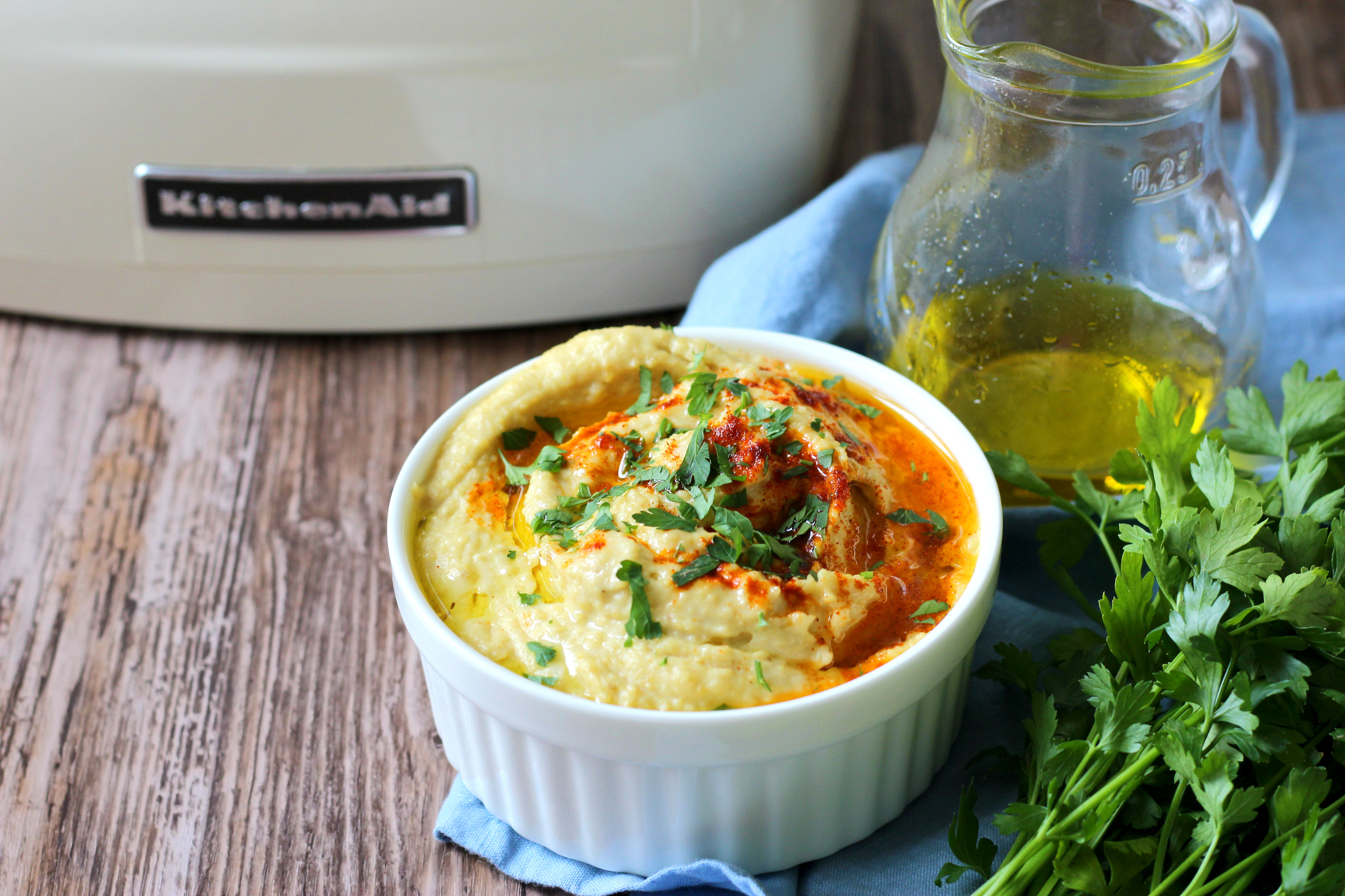 Cizrnu vsypte do food processoru KitchenAid, přidejte olivový olej, sezamovou pastu, česnek a vše rozmixujte na hladký krém. Během mixování můžete směs průběžně ředit opatrným přidáváním studené vody. Hotový hummus ochuťte solí a citronovou šťávou.