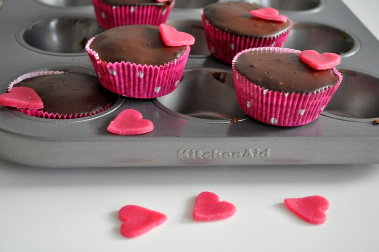 Do misy preosejte múku s práškom do pečiva a kakao. V mixéry vyšľahajte maslo s cukrom do penista. Nad parou si rozpustite čokoládu a dajte na bok aby trocha vychladla. Do maslovej hmoty po jednom zašľahajte vajíčka, keď je zmes dobre vyšľahaná postupne pridávajte preosiatu múku, smotanu a vanilku. Nakoniec pridajte čokoládu. Dobre premiešajte.Formu na muffiny si vyložte papierovými košíčkami. Rúru si predhrejte na 170°C. Každý naplnte asi do dvoch tretín, čo je jedna kopcovitá lyžica hmoty. Naplnené košíčky dajte do rúry na 25min. Kým sa budú košíčky piecť pripravte si gange. Smotanu priveďte skoro k varu, a zalejte ňou čokoládu ktorú ste si pred tým nalámali do misy. Necjate postáť cca 5min a potom vymiešajte. Hotovou čokoládou polejte košíčky. A nechajte v chlade ztuhúť. Na dozdobenie valentýnskych košíčkov si pripravte pomocou marcipánu a pár kvapiek ružového farbiva, srdiečka. Na srdiečka som použila marcipán a potravinárske farbivo DR. Oetker.