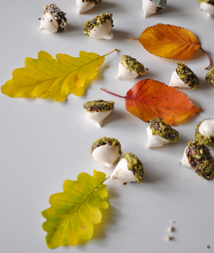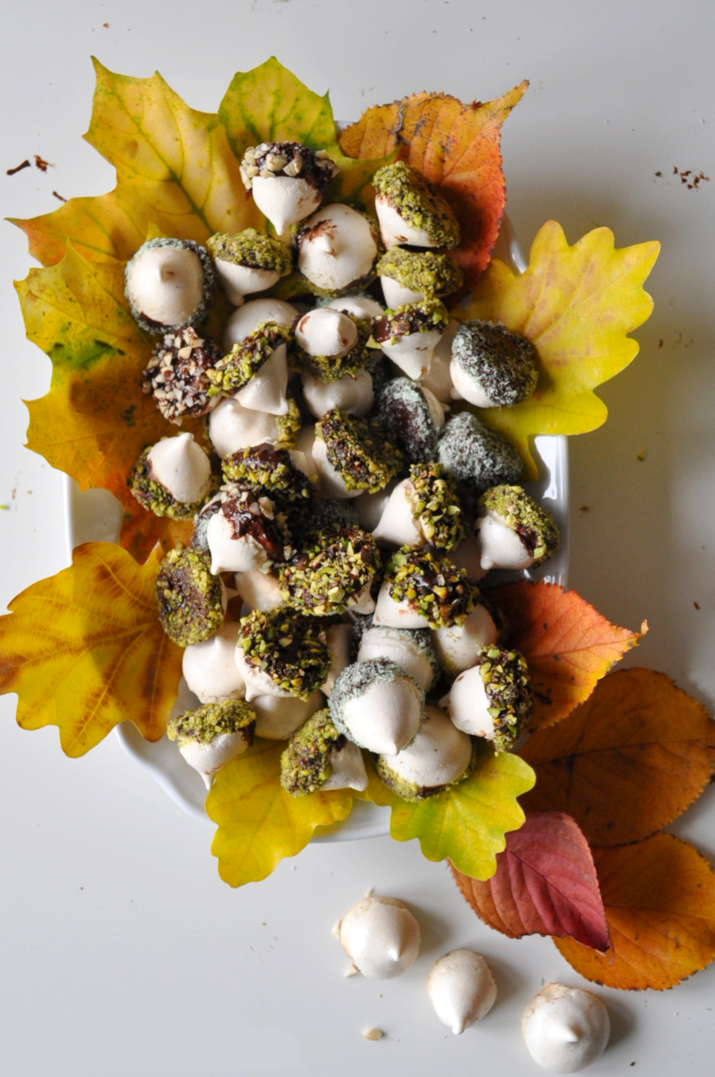 V míse kuchyňského robotu KitchenAid vyšlehejte z bílků a cukru sníh, a přidejte také vanilku. Naplňte cukrářský sáček a okrouhlou špičkou tvořte malé žaludy na plechu vyloženém papírem na pečení. Pečte pomalu při teplotě 140°C asi hodinu, potom vypněte, troubu pootevřete a nechejte asi 10 min vychladnout. Hotové pusinky/žaludy namáčejte do čokolády, kterou jste si předtím rozpustili nad parou (nebo v míse s přesným ohřevem KitchenAid). Oříšky posekejte nebo pomelte, a obalte jimi část pusinek namočenou v čokoládě.
