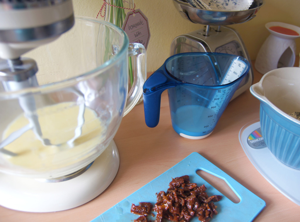 Cuketu nechejte v cedníku okapat a následně z ní ještě vymačkejte zbylou tekutinu. Sušená rajčata nakrájejte nadrobno. Do mísy kuchyňského robotu nalijte mléko, přidejte vejce, olej a pomalu míchejte pomocí plochého šlehače.