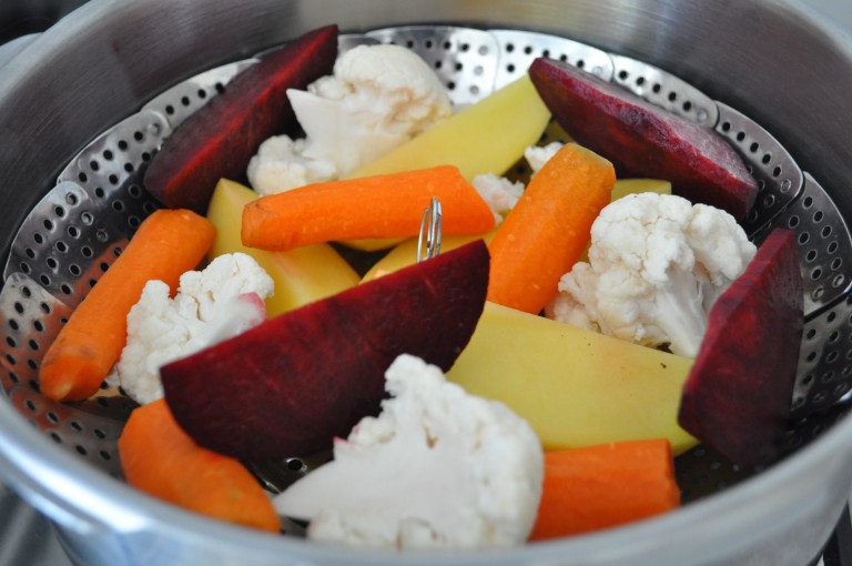 Zeleninu si uvaríme nad parou do mäkka. Repu je potreba variť o niečo dlhšie alebo nakrájajte na menšie kúsky aby sa uvarila/udusila spolu s ostatnou zeleninou.