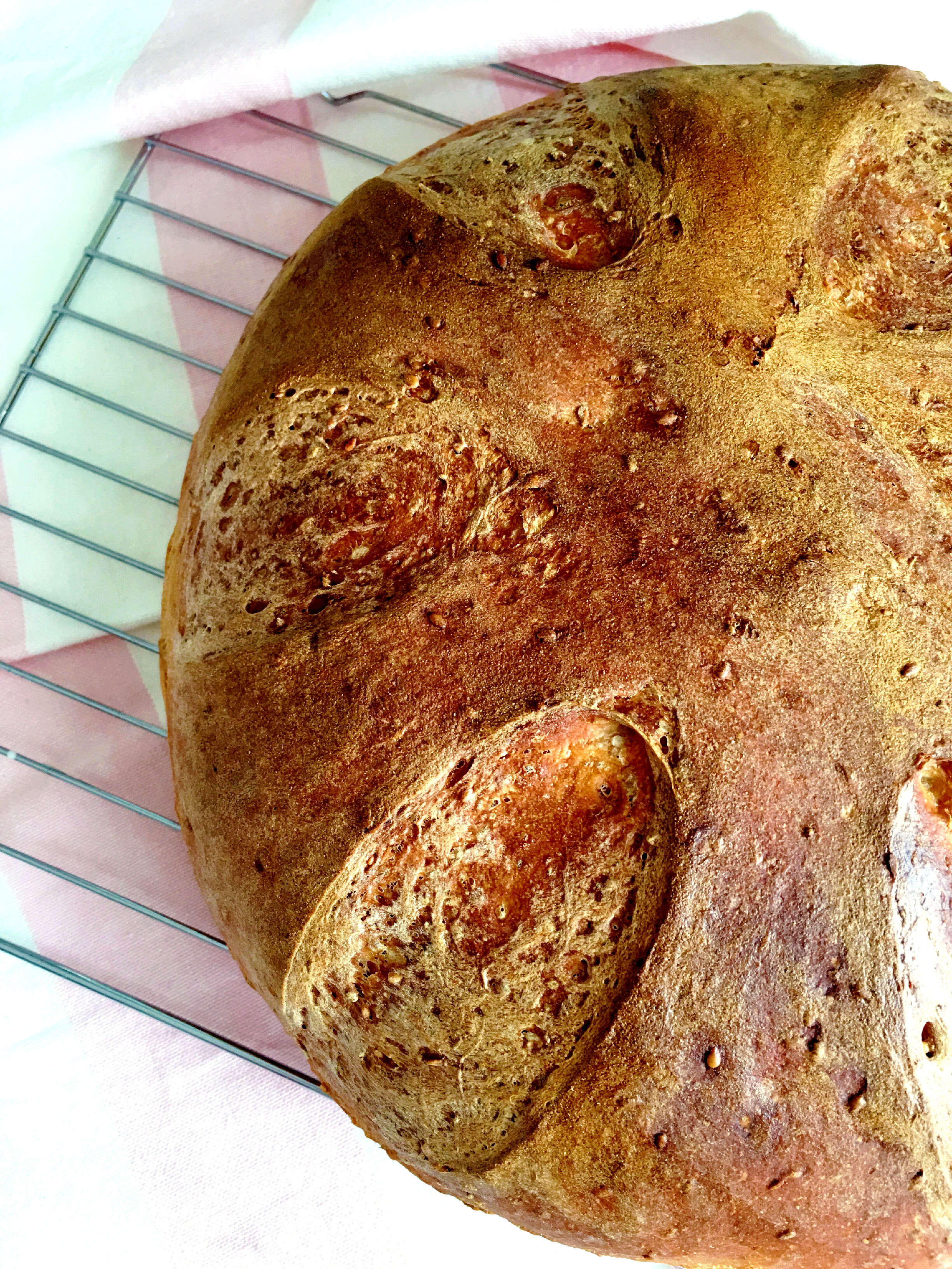Z ingrediencí uvedených k přípravě 1.těsta vypracujte v míse kuchyňského robotu KitchenAid hladké těsto a nechejte hodinku nakynout. Poté k základu přidejte do mísy také suroviny pro přípravu těsta č.2 a vše společně zpracujte do vláčného těsta. Robot nechejte pracovat asi 15 minut. Mísu s hotovým těstem pak překryjte fresh folií a dejte na teplé místo cca 90 minut kynout. Po vykynutí těsto přesuňte na pomoučněnou desku a ručně ještě trochu propracujte, abyste vyhnali všechny bublinky (nejlepší je metoda tzv. "překládání"). Následně vytvořte bochánek, který zploštěte a opatrně přemístěte do formy, ve které budete péct chléb. Žiletkou, ostrou špičkou nože nebo skalpelem vytvořte do bochníku zářezy. Nechejte opět dalších 60 minut dokynout. Chléb před samotným pečením zlehka potřete vodou a vložte do trouby vyhřáté na teplotu 200-220 stupňů. Pečte přibližně 50 minut. V polovině pečení chléb znovu potřete vodou, aby vznikla krásná křupavá kůrka. Po upečení chléb nechejte vychladnout na mřížce.