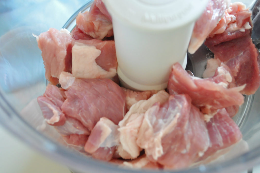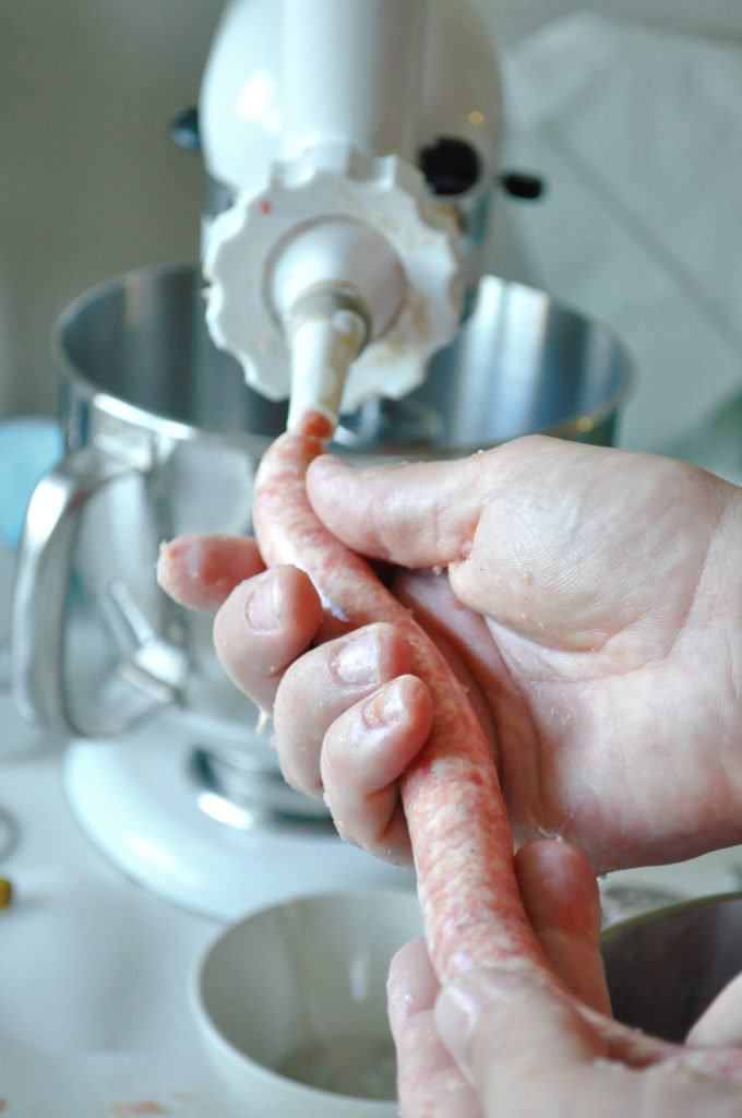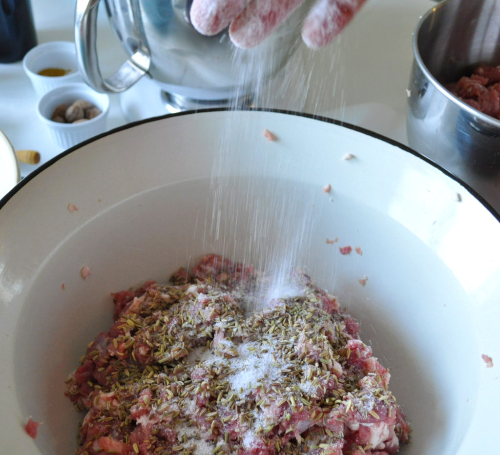 Maso zbavte tvrdých šlach, kůží a jiných těžko stravitelných a nepříliš chutných částí, které nechcete, aby v klobásce byly. Následně maso nasekejte nebo umelte na velmi hrubo (s použitím food processoru nebo mlýnku na maso v kombinaci s kuchyňským robotem KitchenAid).