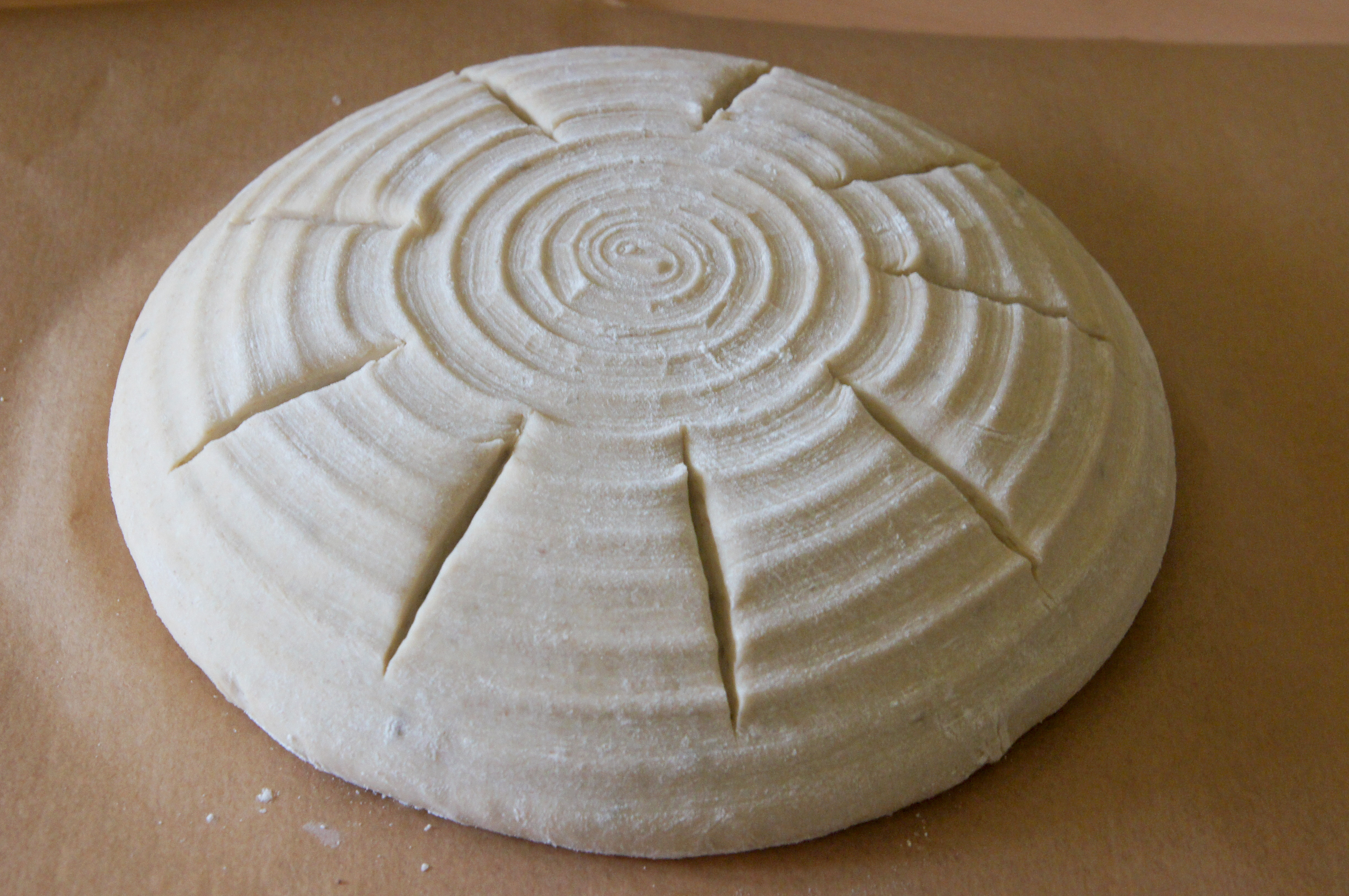 Do mísy kuchyňského robotu KitchenAid vsypte 400 g pšeničné chlebové mouky a přilijte 200 ml vody, 1 a půl lžičky soli a půl lžíce kmínu. Přidejte kvas a pomocí kuchyňského robotu KitchenAid vypracujte těsto (použijte hnětací hák). Nechejte hnětat asi 4 minuty na rychlost 2, dokud se těsto nezačne oddělovat od stěn mísy. Podle savosti mouky přidejte vodu, pokud se zdá těsto husté nebo mouku, když je řídké. Hnětejte ještě další 3-4 minuty.