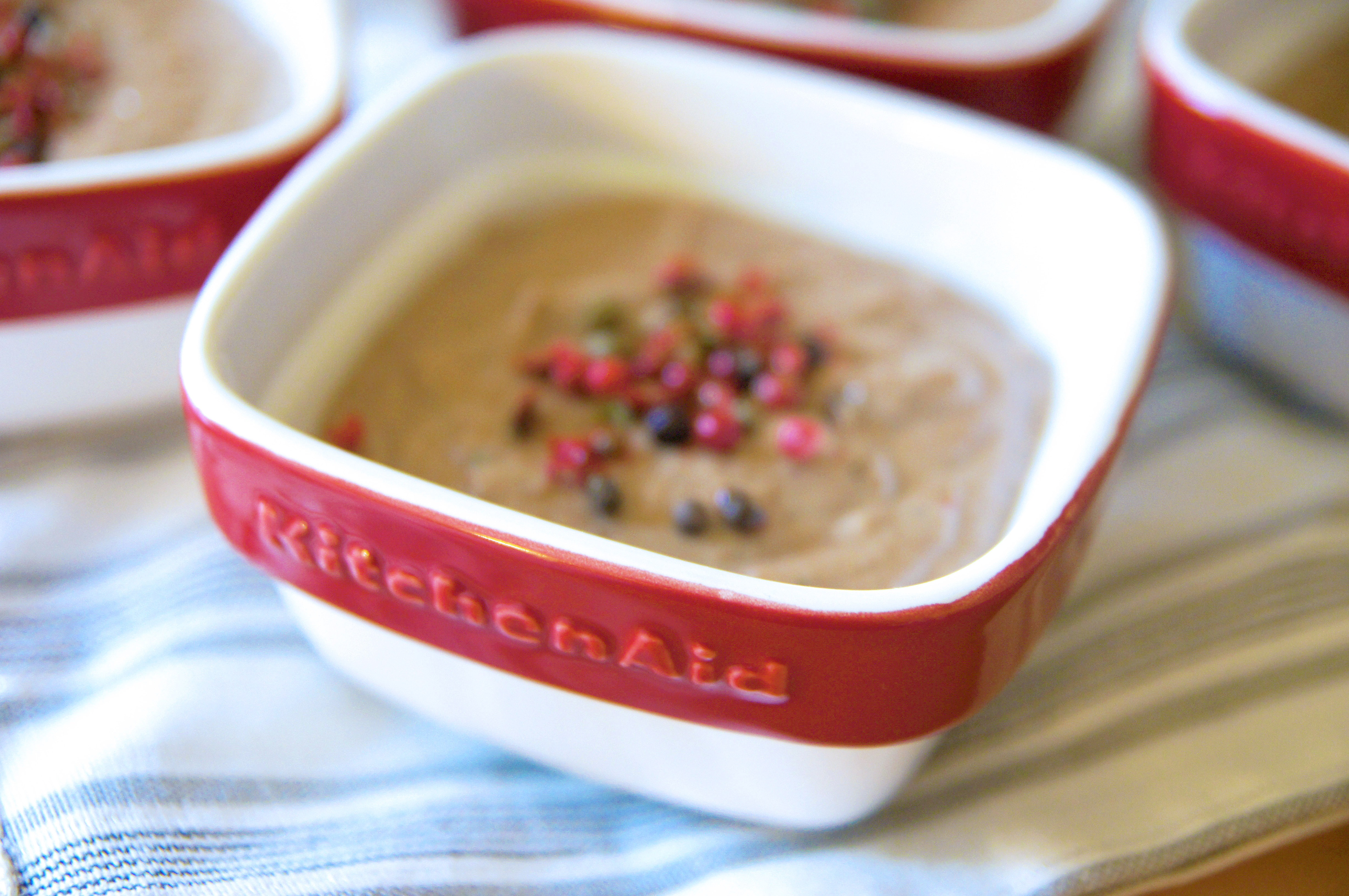 Do pánve dejte lžíci másla, rozehřejte a zprudka játra orestujte (asi dvě až tři minuty, až začnou hnědnout). Přidejte cibulku a restujte dál dozlatova. Přidejte tymián a sůl, a dvě lžíce bílého vína. Tekutinu nechejte téměř vyvařit a poté přilijte dvě lžíce smetany. Lehce provařte a odstavte z plotny. Do sekáčku KitchenAid vložte hotovou směs s játry a mixujte. Postupně přidejte zbytek másla a znovu mixujte, až je hmota hladká. Osolte, nalijte do keramických ramequins KitchenAid a nechejte v lednici ztuhnout. Ozdobte kuličkami barevného pepře.