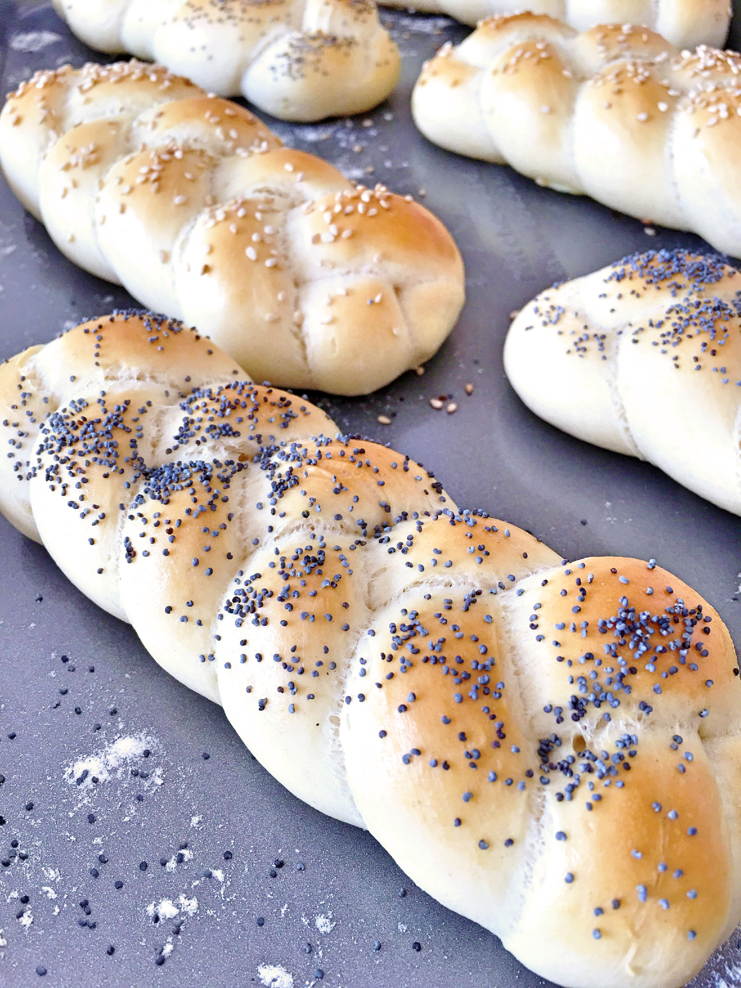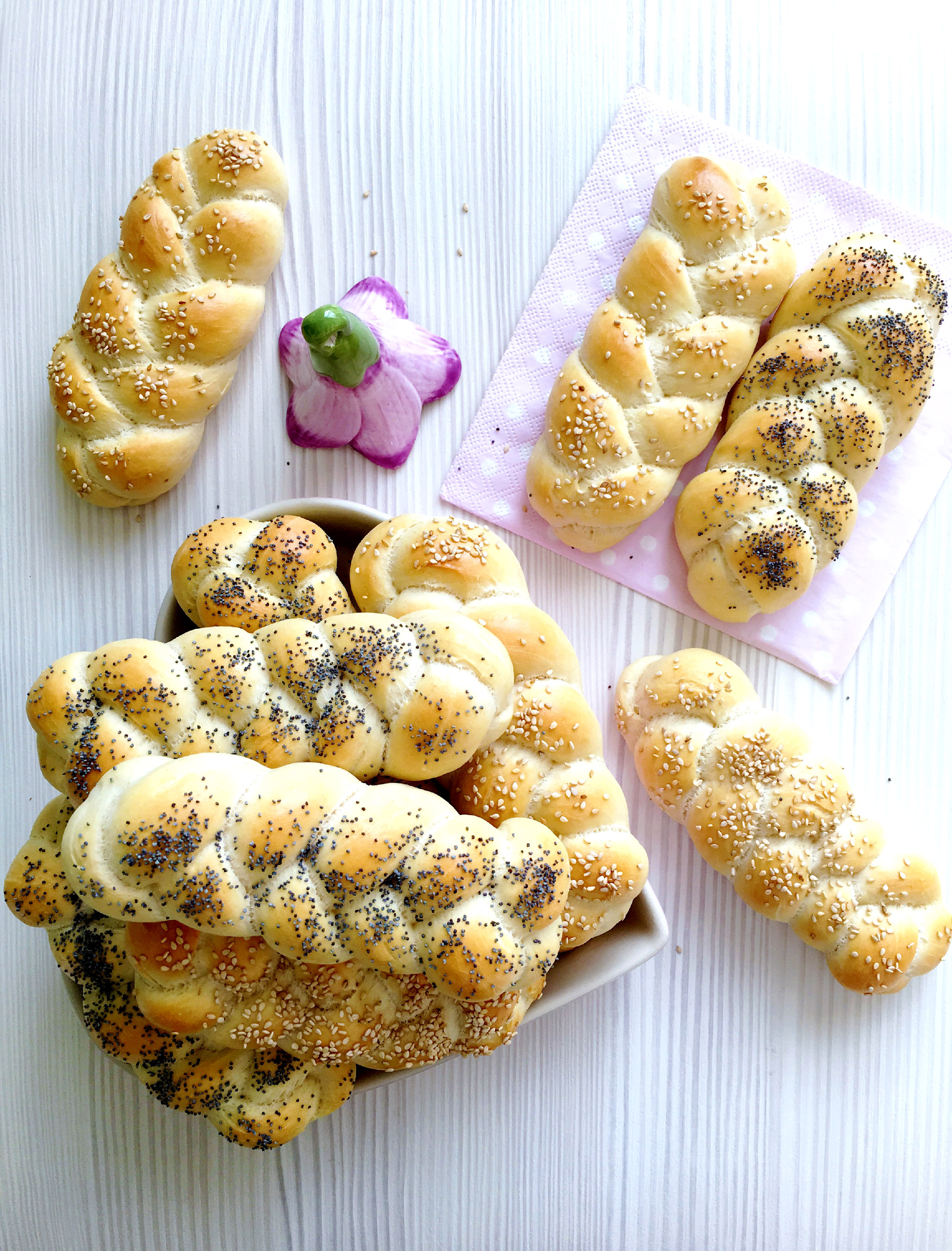 Suroviny pro přípravu těsta vložte do mísy kuchyňského robotu KitchenAid a pomocí hnětacího háku vypracujte v jednolité těsto, které následně nechejte alespoň hodinku kynout na teplém místě. Po vykynutí rozdělte na 12 dílů, ze kterých upleťte houstičky. Ty pak rovnoměrně rozprostřete na pečící plech KitchenAid (ponechejte dostatečné rozestupy - pečivo během kynutí ještě přibude na objemu :-) ) a nechejte kynout další 1/2 hodiny. Po vykynutí potřete žloutkem vyšlehaným s mlékem, posypejte semínky a pečte v troubě vyhřáté na teplotu 160 stupňů asi 15-20 minut. Rada: na spodek trouby během pečení položte kastrůlek s horkou vodou (pečivo bude díky odpařované vodě nadýchanější).