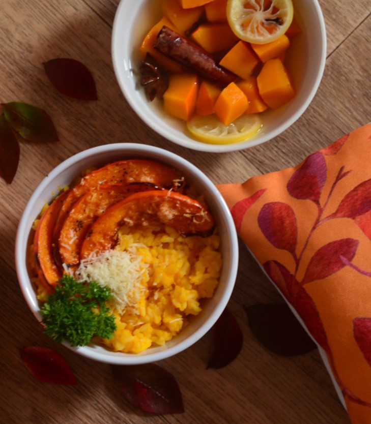 Šalotku nakrájíme, orestujeme na ghí s rýží a podkápneme bílým vínem. Necháme povařit a přidáváme domácí vývar. Mezitím si nakrájíme dýni, kterou rozmixujeme a přidáváme do rizota. Vaříme doměkka. Osolíme, opepříme a podáváme s nastrouhaným parmazánem. Já ještě přidávám pečenou dýni s balkánským sýrem.