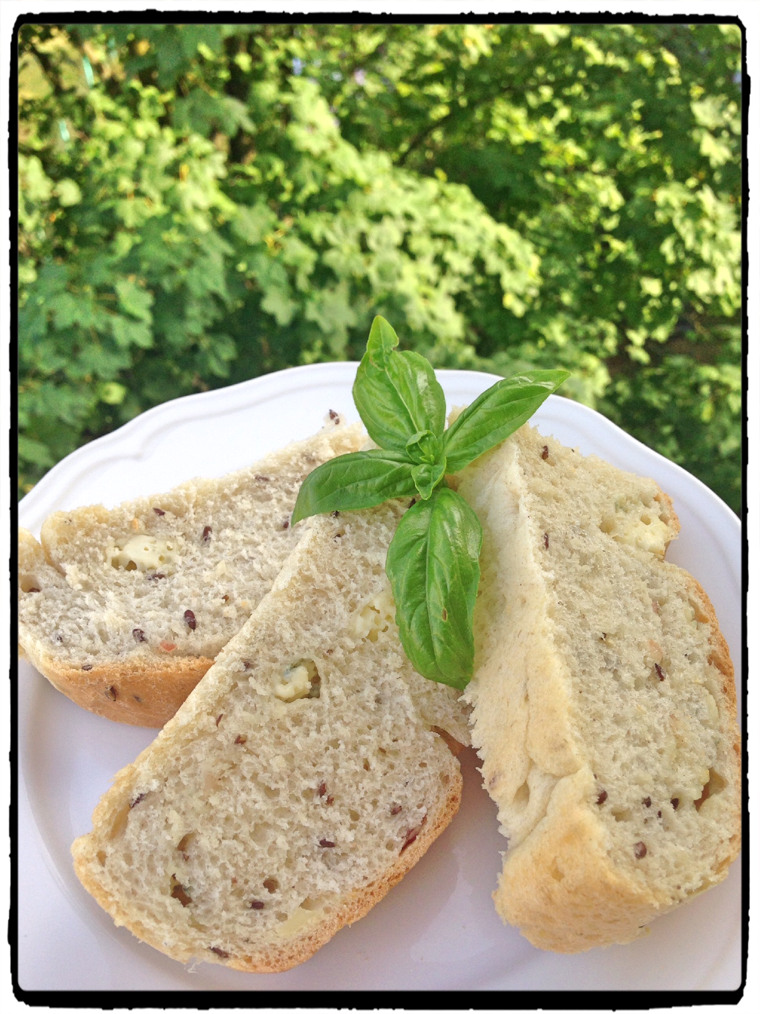 Nejdříve si připravte kvásek (droždí, voda, cukr, trochu mouky) a nechejte vzejít na teplém místě. Ostatní zbývající ingredience (kromě sýra a semínek) nasypte do mísy, nasaďte hnětací hák na robot a vlijte kvásek. Robot pak nechejte pomocí hnětacího háku hnětat těsto cca 10 min. Jakmile máte těsto hotové, zakryjte mísu potravinářskou folií a nechejte min. 40 min kynout (dokud těsto nezdvojnásobí objem). Po vykynutí do těsta ještě lehce zapracujte sýr a lněná semínka. Pečící mísu (nejraději používám keramickou) vytřete olejem a vtlačte do ní těsto. Do těsta udělejte prstem důlky typické pro focacciu a jemně potřete olejem. Nechejte ještě 20 min. kynout. Mezitím si vyhřejte troubu na 200 stupňů a na dno trouby umístěte kastrůlek s vodou (aby těsto krásně vyběhlo a bylo vláčnější). Pečící mísu s těstem pak vložte do trouby a nechejte péct 35-45 min. Hotový chlebík nechejte vychladnout, nakrájejte na plátky a servírujte ideálně s mozzarelou a rajčátky.