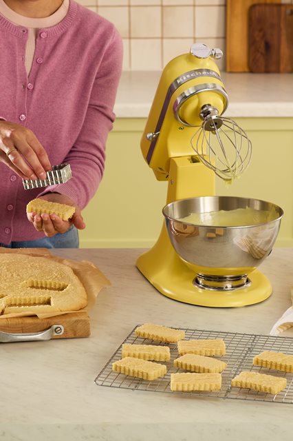 V kuchyňském robotu KitchenAid smíchejte plochým šlehačem cukr a citronovou kůru. Přidejte změklé máslo a míchejte na rychlost 4 po dobu 2 - 3 minuty. Snižte rychlost na 2 a přidejte žloutek a šťávu z yuzu (citronu). Jakmile se všechny ingredience spojí snižte rychlost na 1 a přidejte mouku, moučkový cukr, kukuřičný škrob a sůl. Míchejte dokud se těsto nespojí cca 1 minutu.