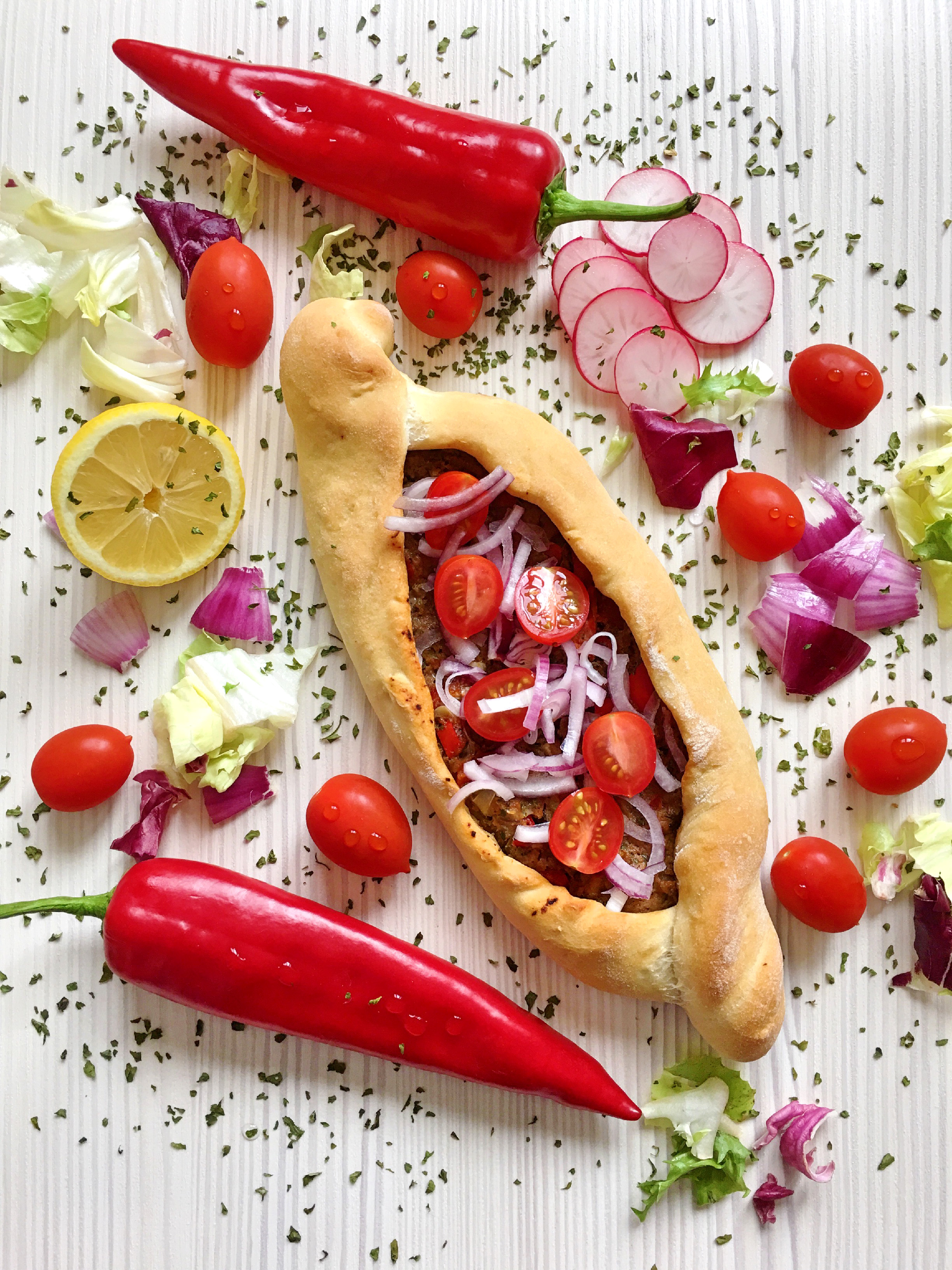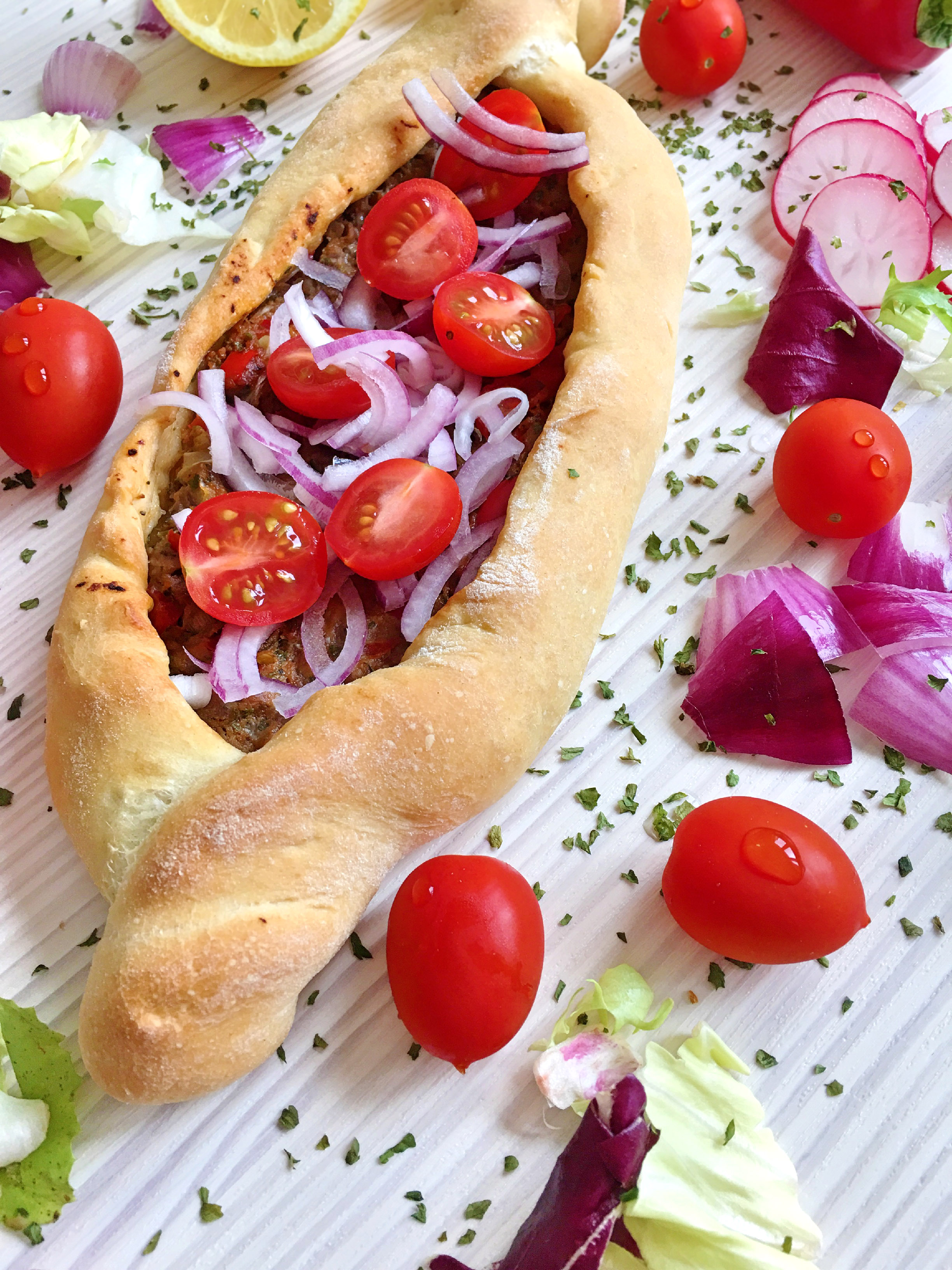 Připravte si kvásek (droždí s cca 10 g hladké mouky, 1 lžičkou cukru a částí vlažné vody - smíchat do řídkého těstíčka) a nechejte vzejít na teplém místě (asi 10 minut). Do mísy kuchyňského robotu KitchenAid vložte všechny suroviny pro přípravu těsta, přilijte kvásek a nechejte zpracovat pomocí hnětacího háku v krásné hladké těsto. Nechejte kynout v míse přikryté utěrkou min. 1 hodinu na teplém místě. Vykynuté těsto ještě ručně lehce propracujte, a rozdělte na 6 dílů. Každý díl rozválejte do tvaru elipsy (PIDE) nebo kruhu (LAHMACUN) – podle toho co chcete tvořit. Já dělala elipsy. Maso si namelte pomocí mlýnku na maso FGA, a smíchejte s dalšími uvedenými přísadami pro výrobu náplně. Hotovou náplní pak potřete každý z připravených korpusů z těsta a zaviňte. Tvary pak přemístěte na plech vystlaný pečícím papírem a pečte v troubě vyhřáté na 230 stupňů asi 17-20 min. Po upečení ihned podávejte nebo nechejte vychladnout na mřížce a podávejte studené.