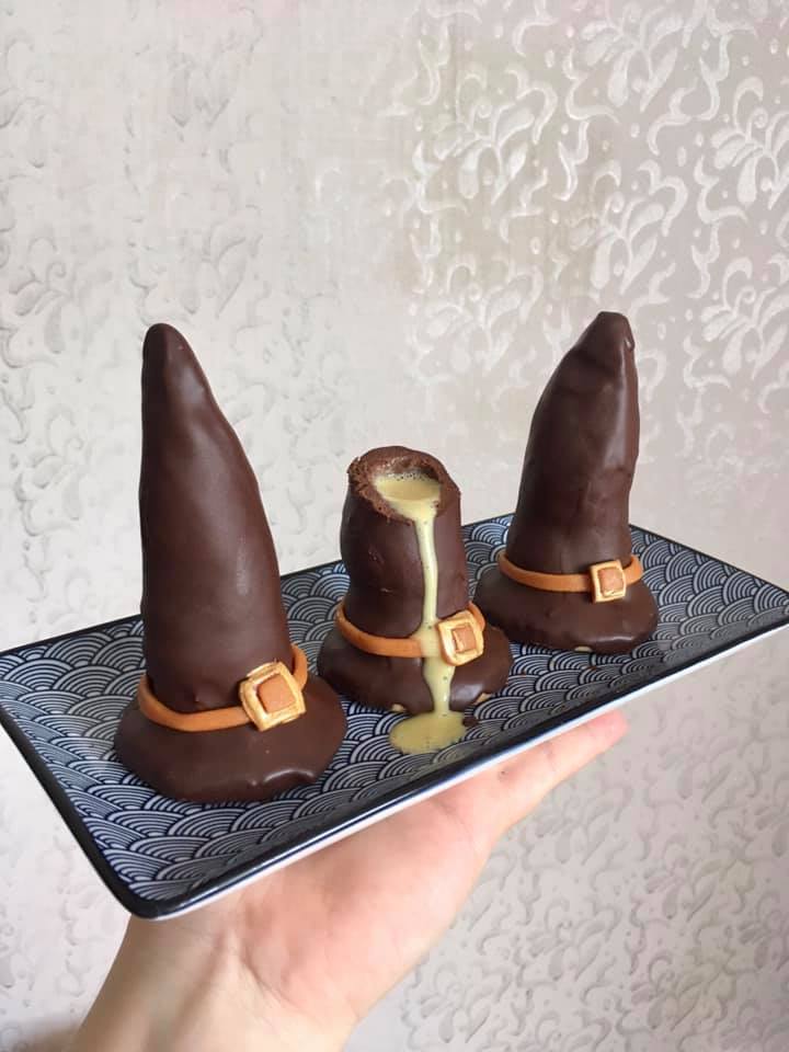 „Vybrala jsem si truhlu číslo 3, která v sobě ukrývala čarodějnický klobouk. Říkala jsem si, že to je celkem výzva. Začala jsem vymýšlet, co bych udělala. Jako první mě napadl cupcake, ale já chtěla předělat něco typicky českého. Tak jsem předělala likérové špičky na čarodějnický klobouk. Udělala jsem daleko větší bufler (piškot) a prohrála si s vrcholem při uzavření špiček.“