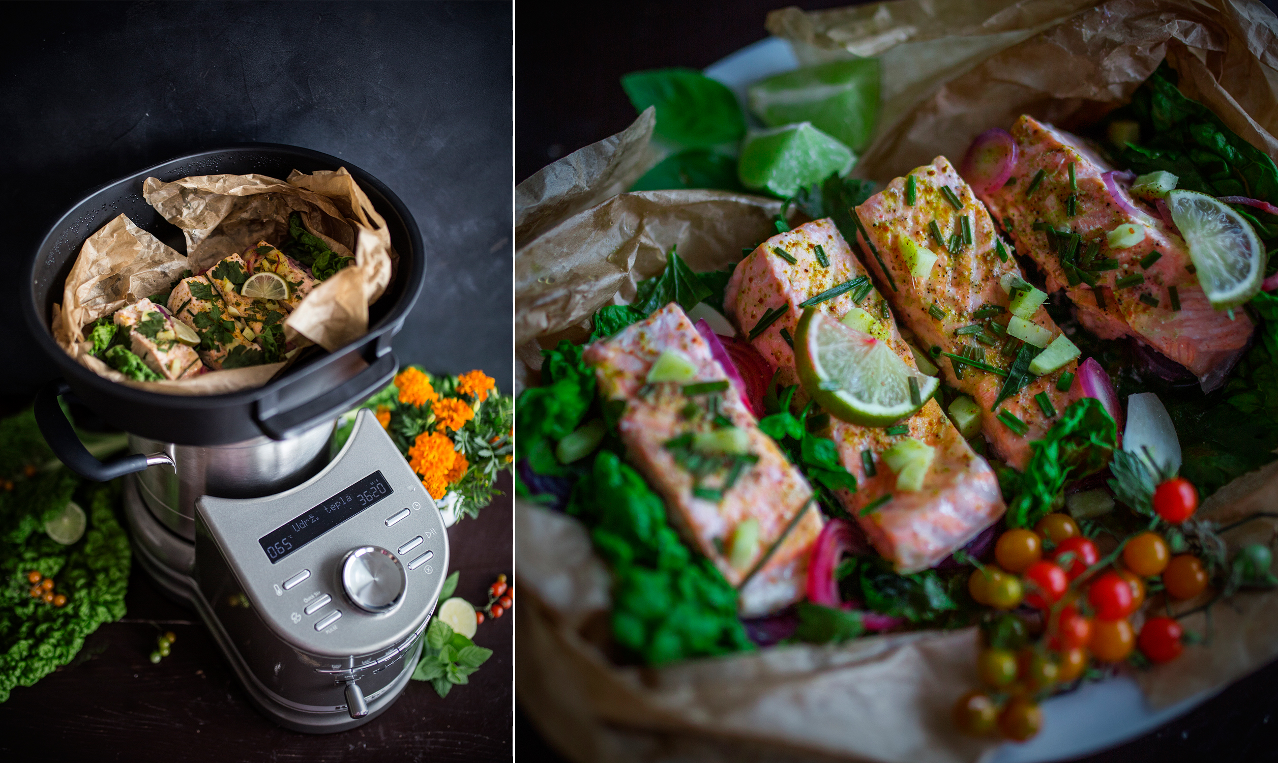 Je veľmi jednoduchý a zeleninu si môžeme nakrájať samy alebo ju dáme nakrájať robotovi. Dáme preč z robota veko a vyberieme nôž. Do misy nalejeme cca 400ml vody. Z papiera na pečenie vytvoríme 1 veľký balíček, do ktorého vložíme najprv mangold/špenát a naň uložíme nakrájaného lososa. Osolíme ho, okoreníme, pokvápeme šťavou z limetky a poukladáme na neho / okolo neho nakrájanú zeleninu. Opatrne balíček zabalíme a vložíme do naparovacieho hrnca. Pevne uzavrieme vekom od naparovacieho hrnca a zvolíme režim varenia v pare STEAM P1 a potvrdíme tlačidlom start. Keď bude robot hotový, balíček vyberieme a môžeme lososa podávať. Hodí sa k nemu čerstvá zelenina, kus-kus alebo pečené zemiaky.