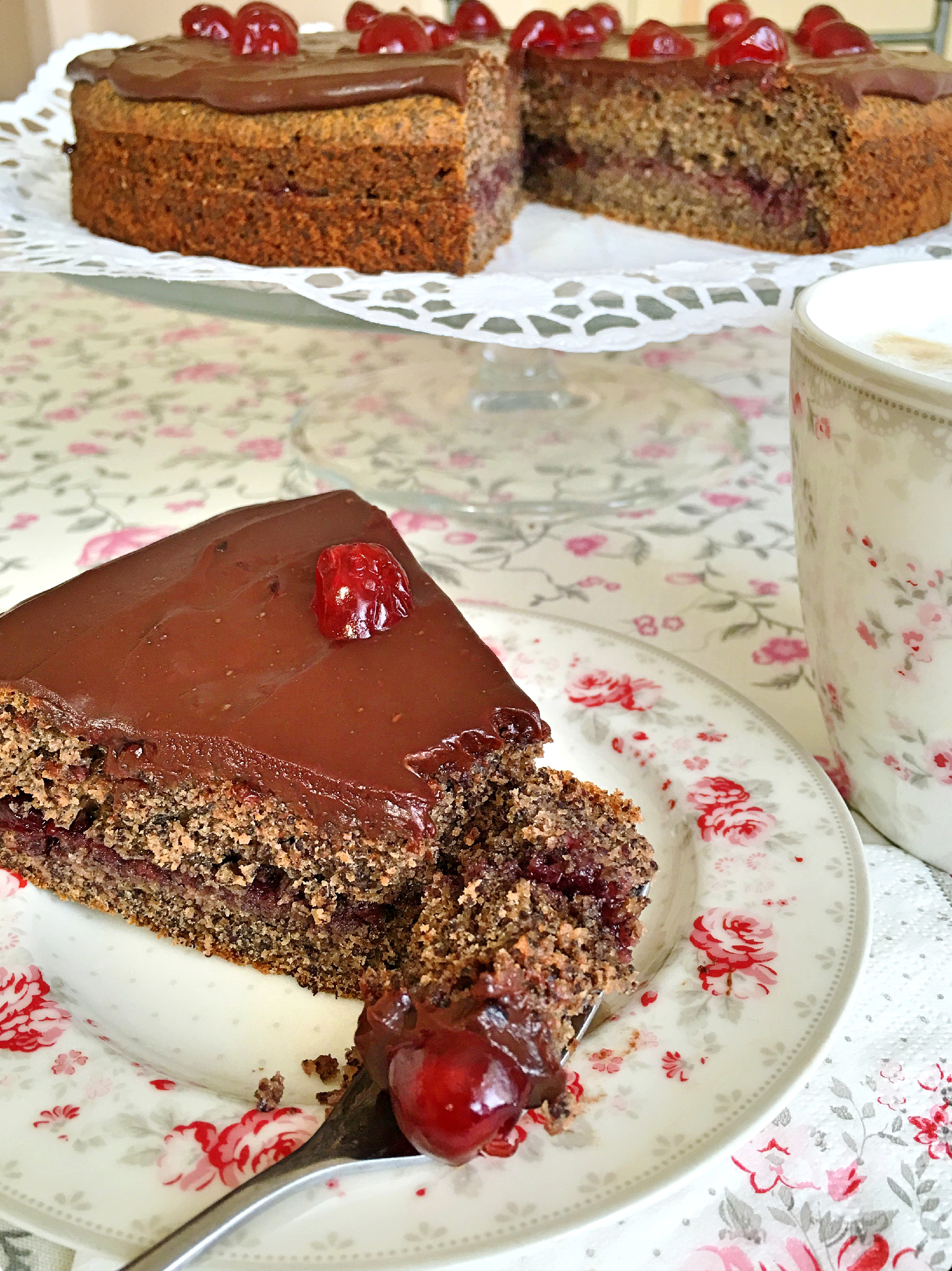 V míse kuchyňského robotu KitchenAid vyšlehejte pomocí balónové metly máslo s vejci a sirupem do hladké hmoty.Ve druhé míse smíchejte všechny sypké přísady - mouky, mletý mák, kakao, prášek do pečiva. Tuto směs pak postupně zašlehejte do tekuté směsi a přilijte také mléko.Hotové těsto musí být hladké, bez hrudek.Těsto nalijte do formy a vložte do vyhřáté trouby na teplotu 170 stupňů. Pečte cca 50-60 min.Po upečení nechejte „makovec“ vychladnout. Po vychladnutí jej rozkrojte podélně na dvě části a potřete pikantní marmeládou. Na závěr si rozpusťte čokoládu a vyšlehejte s kysanou smetanou. Touto hmotou rovnoměrně potřete povrch makovníku a ozdobte kandovanými třešněmi.