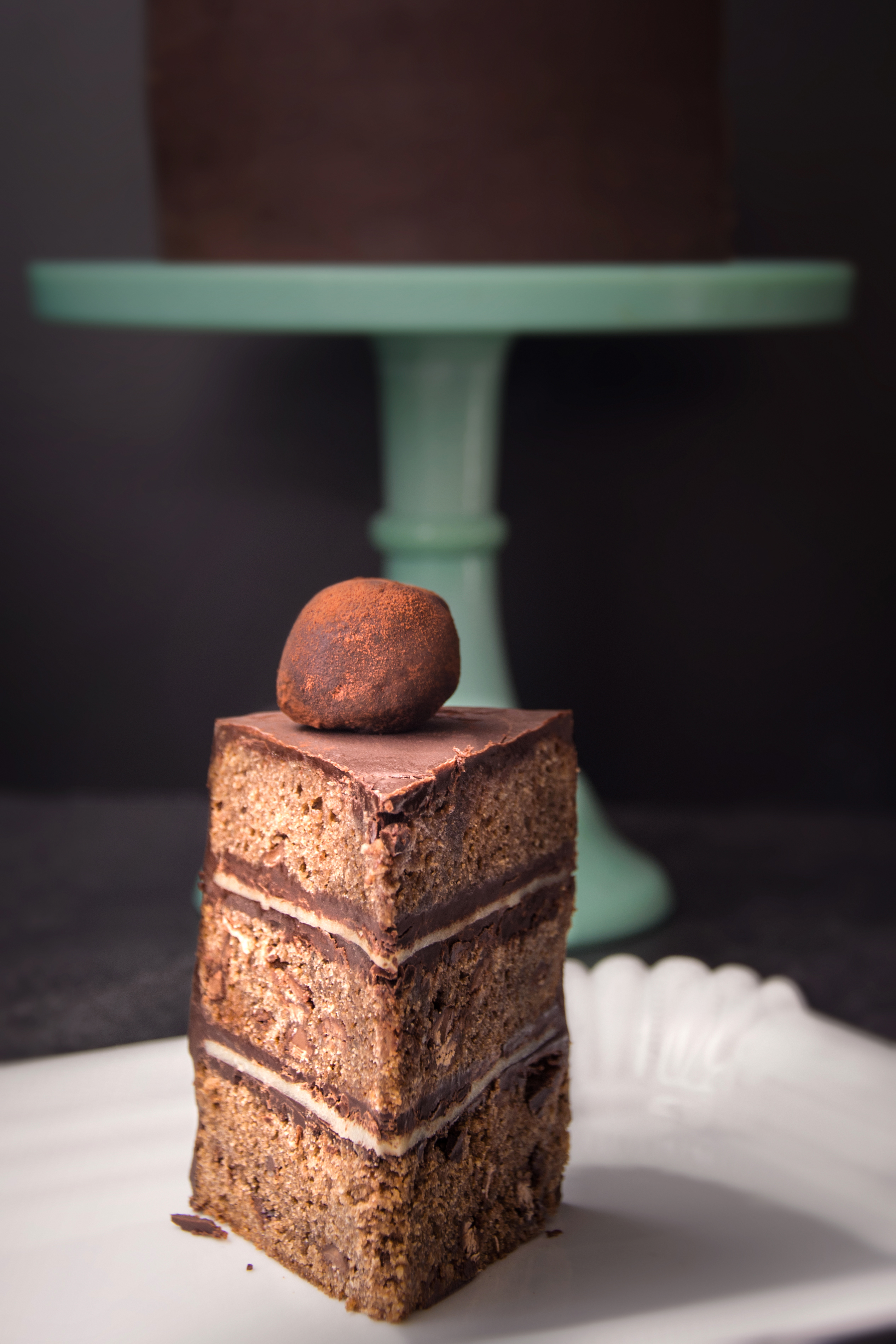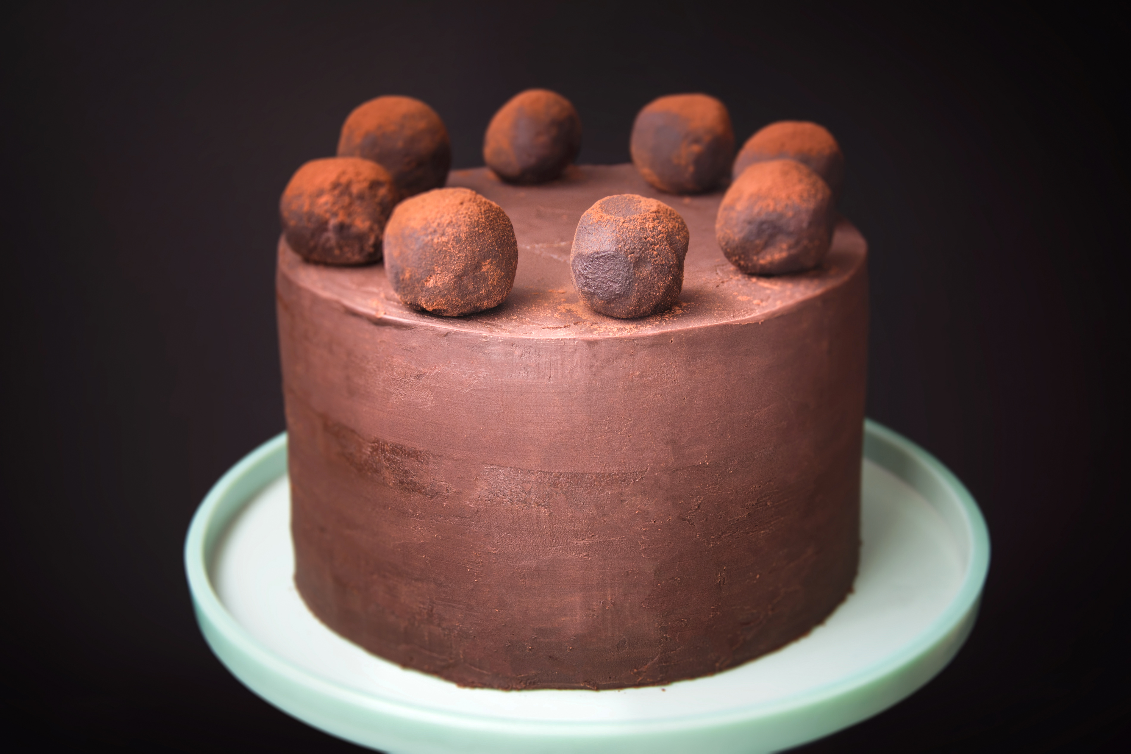 „Čepice“ korpusů seřízněte do rovna a uschovejte na později. Větší korpus rozřízněte na dvě poloviny. Na první část naneste ganache, položte na ni marcipán a opět naneste ganache. Opakujte to i s další částí. Až bude dort kompletní, pomažte ho ze všech stran a rovnoměrně ganache rozetřete. Zahlaďte strany a vytvřte co nejostřejší hranu. Dejte zatuhnout do lednice na 30 minut. Mezitím rozmixujte čepice z korpusů s trochou ganache a uválejte 8 kuliček. Tyto kuličky posypte kakaem a ozdobte jimi dort.