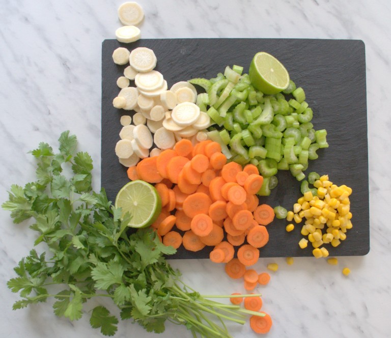 Vo väčšom hrnci na oleji osmažíme cibuľku a pridáme koreňovú zeleninu. Smažíme cca 10min. Zeleninu môžete doplniť aj kalerábom alebo inou koreňovou zeleninou ale aj tu platí, menej je viac. Myslím, že najdôležitejšou ingredienciou je koriander.