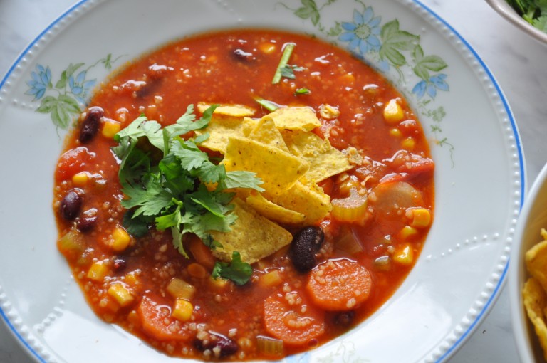Síce je to s ním tak že ho niekdo miluje a iný nenávidí, ale túto polievku dopĺňa skvelo. Keď je zelenina polomäkká pridáme konzervu fazule, kukurice. Varíme 10min. Podľa potreby podlejeme vodou. Pridáme konzervu paradajok, dochutíme. Ak je polievka kyslá dosladíme agávovým sirupom. Na záver pridáme kuskus a varíme aby polievka zhustla. Alebo odstavíme a kuskus dojde za cca 10min. Dochutíme koriandrom a limetkou. Podávame s tortilla chipsami.