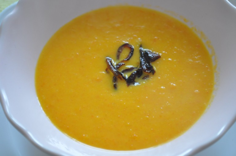 Ve středně velkém hrnci si na olivovém oleji poduste šalotku nakrájenou na drobno. Jakmile je hotová, cca tak po 10 minutách, přidejte nakrájenou mrkev, osolte a přidejte i koření. Zalejte vodou nebo vývarem a duste zhruba 30 minut. Potom přidejte zázvor. Jakmile je mrkev měká polévku odstavte a ponorným mixérem rozmixujte. Vraťte na sporák, přidejte kokosové mléko a nechejte krátce povařit. Pokud je potřeba ještě polévku dochuťte. Polévku není otřeba zahušťovat. Nelekněte se, kokosové mléko v konzervě je dost husté, ale to není nazávadu. Je tekuté až při teplotě 18°C. Hotovou polévku podávejte s opraženou cibulkou nebo s chilli.