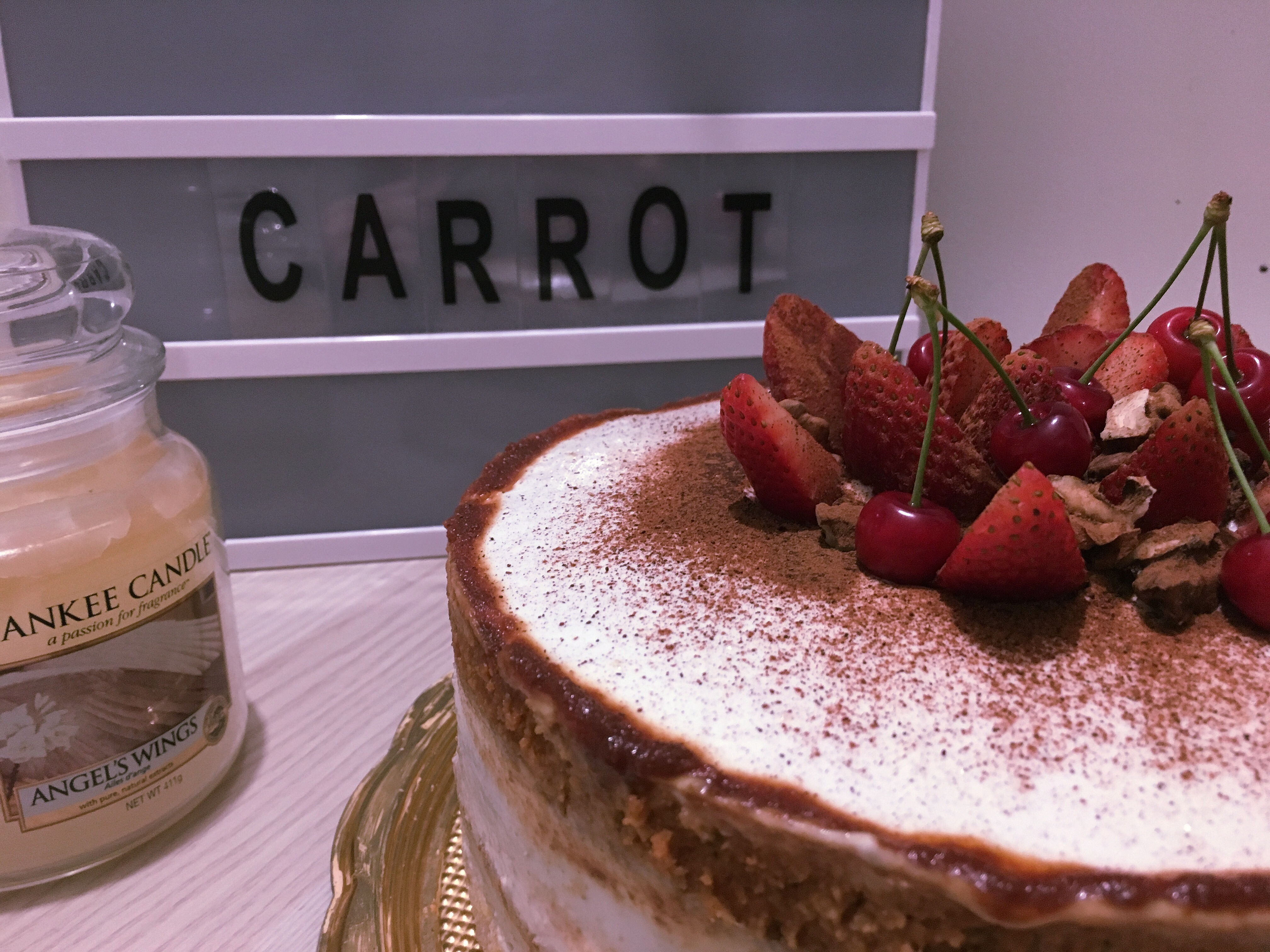 Celý můj výtvor jsem ještě doladila krémem z tvarohu a zakysané smetany, což se mi k němu nejvíce hodilo, jahodami, třešněmi, ořechy av neposlední řadě skořicí.