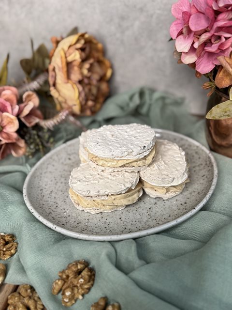 Na laskonky zmiešame bielky s cukrom a vo vodnom kúpeli miešame kým sa cukor roztopí a změs je horúca na dotyk s teplotou aspoň 71 stupňu Celsia. Presunieme do robota s metličkou a miešame do vychladnutia. Nakoniec vmiešame práškový cukor a orechy. Zmes natlačíme do laskonkovej formičky. Aby mali laskonky rovné hrany stierkou formu pretrieme do štyroch strán. Laskonky najskór pečieme pri 120 stupňích Celsia 15 minút, potom teplotu znížime a sušíme ich pri 80 stupních Celsia ďalších 30 minút.