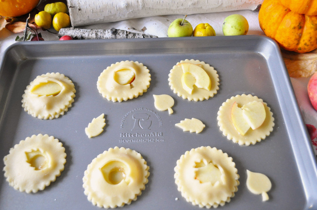 V míse kuchyňského robotu KitchenAid zpracujte všechny suroviny v těsto, a dejte do chladu asi na půl hodiny. Jablka zbavte jádřinců a nakrájejte na plátky. Vložte do mísy, přidejte šťávu z citronu, cukr a zamíchejte. Těsto vyjměte z lednice, vyválejte na podložce a vykrájejte z něj úhledné kroužky. Na každý kroužek z těsta pak položte kousek jablka a přikryjte druhým kroužkem těsta (pro lepší efekt si můžete do vrchních kroužků z těsta vykrojit oblíbené tvary pomocí vykrajovátek - já mám pro tyto příležitosti v zásobě podzimní vzory :-) ). Na závěr potřete vyšlehaným vejcem a posypejte hnědým cukrem. Pečte na nepřilnavém pečícím plechu na sušenky KitchenAid v předehřáté troubě na 180°C, cca 15min. dozlatova. Díky nepřilnavé úpravě si nemusíte lámat hlavu s vymazáváním nebo vykládáním plechu pečícím papírem. Koláčky se v žádném případě nepřipečou.v