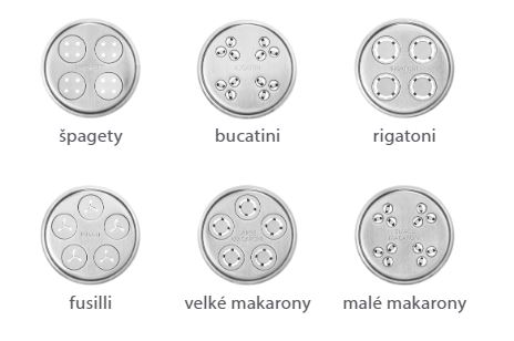 Pokud se při výrobě těstovin nespokojíte pouze s nudlemi a chcete víc, pak vyzkoušejte tento všestranný lis. S pomocí 6 kotoučů si můžete vyrobit těstoviny různých tvarů a délek: Bucatini - dlouhé, úzké, duté těstoviny Fusilli - spirálovité těstoviny (vrtulky) Makaróny (velké i malé) - těstoviny trubicového tvaru s vroubky Rigatoni - široké těstoviny trubicového tvaru s vroubky a špagety.