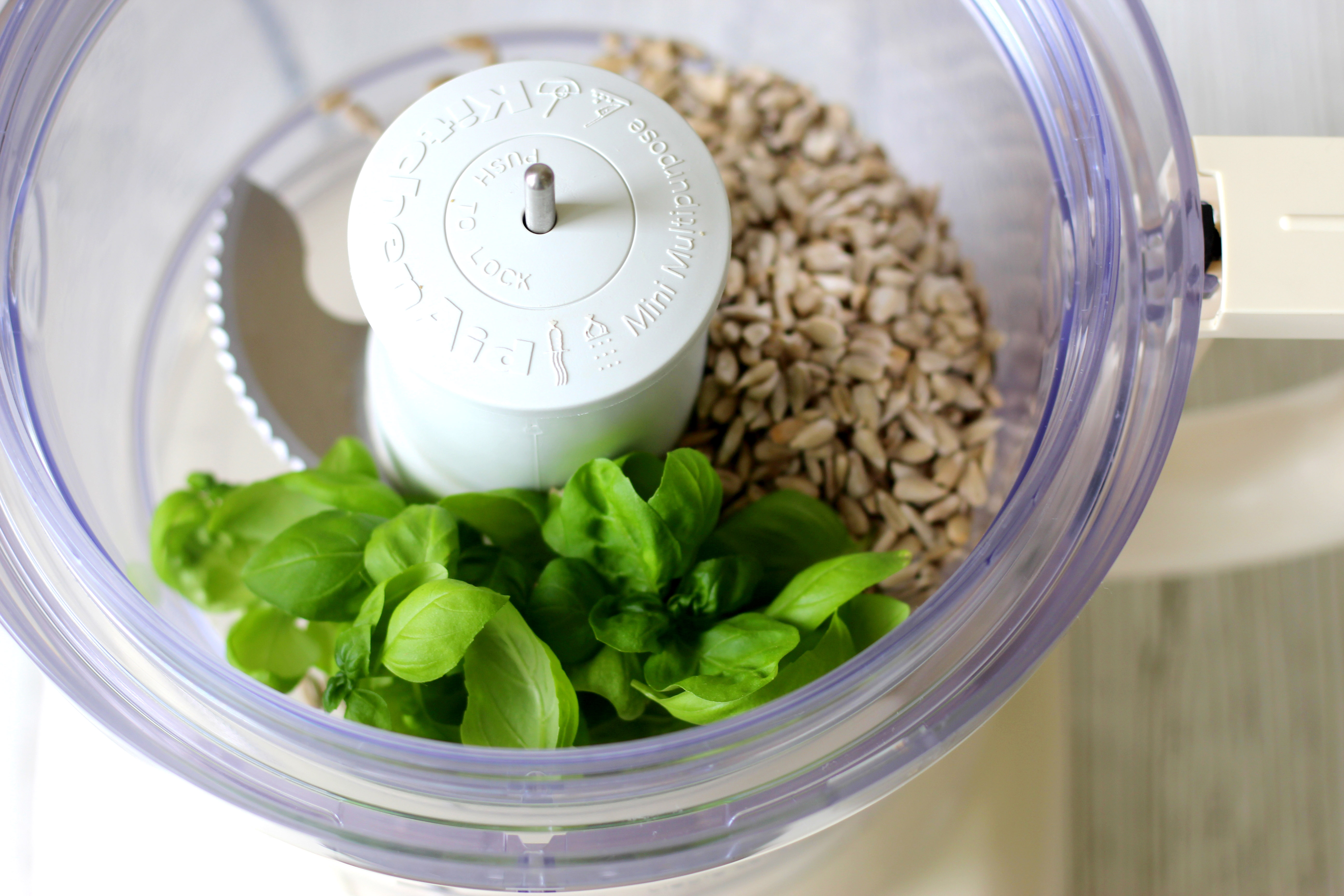 Do food processoru vsypte hrst slunečnicových semínek a přidejte bazalkové lístky. Směs začněte mixovat a postupně přiléváme po troškách olivový olej. Jakmile jsou semínka rozmixovaná, máte hotovo.