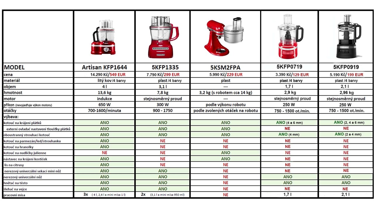 Pro ty, kteří přemýšlejí o větším typu food processoru, zde mám přehlednou tabulku od KitchenAid se srovnáním všech dostupných typů.