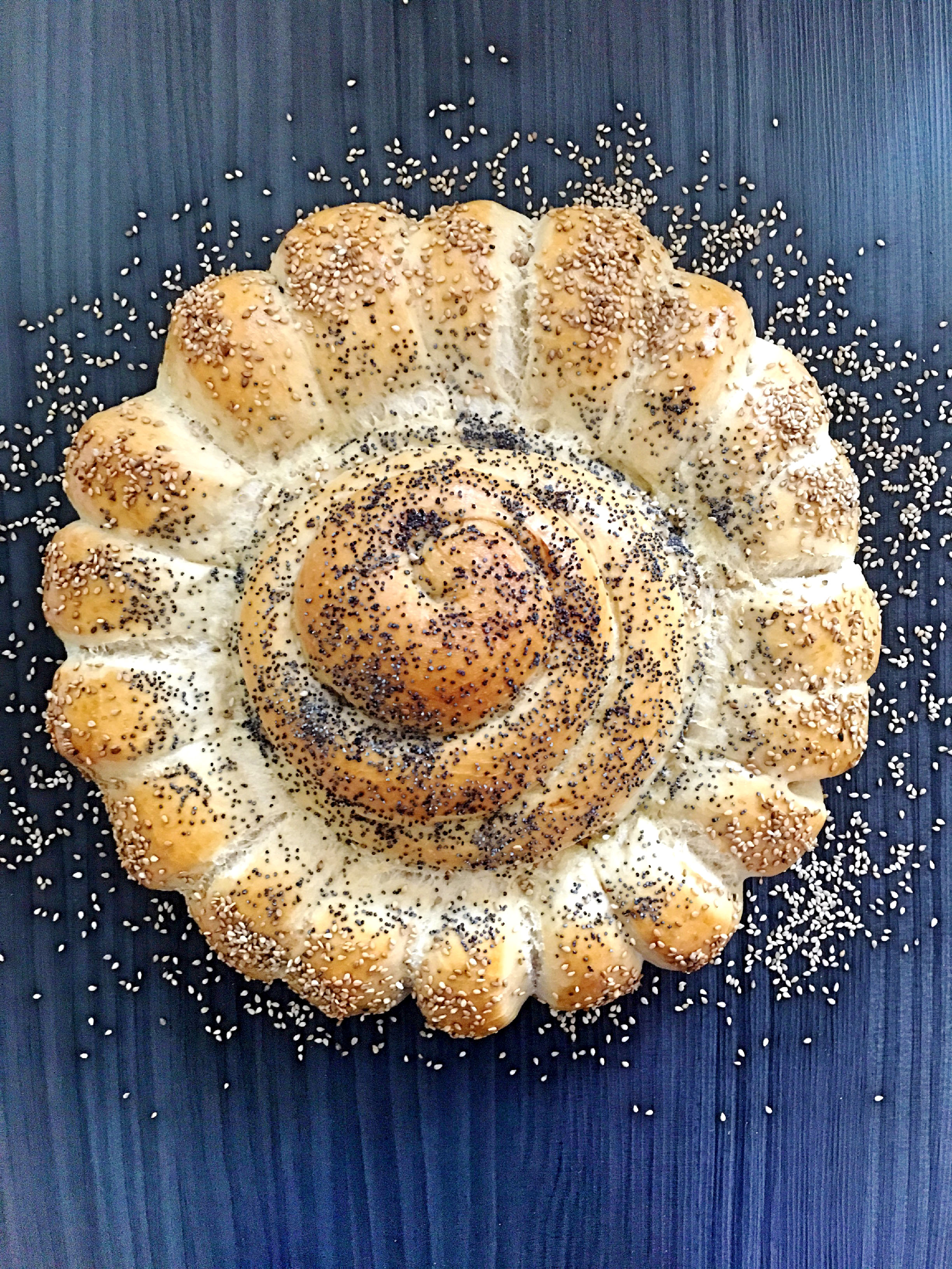 Připravte si kvásek smícháním uvedených surovin a nechejte vzejít na teplém místě (asi 10 minut). V míse kuchyňského robotu KitchenAid smíchejte všechny suroviny pro přípravu těsta, přilijte kvásek a nechejte zpracovat v krásné hladké těsto. Hotové těsto nechejte přikryté utěrkou kynout cca 50 min. na teplém místě. Vykynuté těsto rozdělte na tři stejné díly (1/3 na středový šnek a 2/3 na lístky/špalíčky). Z 1/3 těsta vyválejte dlouhého hada, kterého stočte jako šnečí ulitu. Další 2/3 těsta rozválejte na obdélník, zaviňte a nakrájejte na 1,5 -2 cm široké špalíčky. Kulatou pečící formu si vystelte pečicím papírem, doprostřed uložte šnečí ulitu a kolem postupně naskládejte špalíčky těsta. Nechejte kynout (asi 30 min), pak potřete rozšlehaným žloutkem s mlékem, posypejte mákem a sezamem a pečte v troubě vyhřáté na 200 stupňů asi 35-40 min. Květinu po upečení položte na mřížku a nechejte vychladnout. Servírujte tak, že si každý utrhne/uloupne kousek a namaže dle libosti - nejlépe chutná s máslem :-)