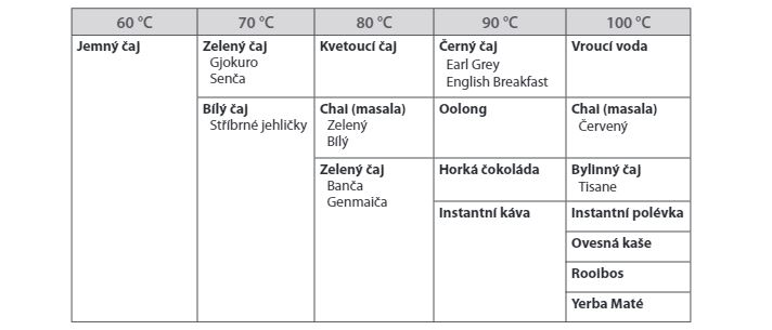 Nastavení teploty vody - pokud patříte k čajovým či kávovým gurmánům, jistě uvítáte možnost nastavení teploty vody na takovou, kterou potřebujete pro daný nápoj. Chybou začátečníků bývá automatické zalití všech nápojů vroucí vodou, která může být pro některé čaje nevhodná. V přehledné tabulce Vám přinášíme zjednodušený seznam nápojů a jejich teplot, tak abyste si mohli doušek Vašeho moku vychutnat co nejlépe.