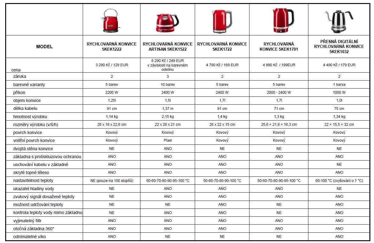 Abyste si lépe mohli porovnat parametry jednotlivých rychlovarných konvic KitchenAid, zde je ještě přehled všech výše uvedených informací: