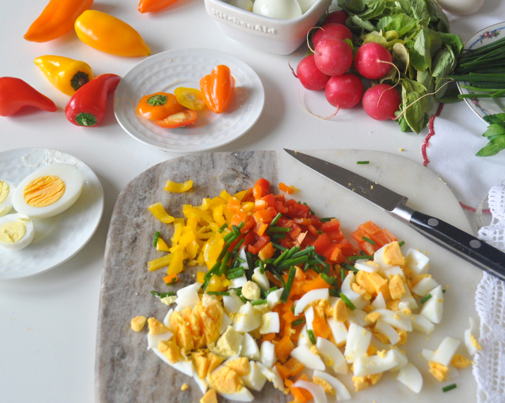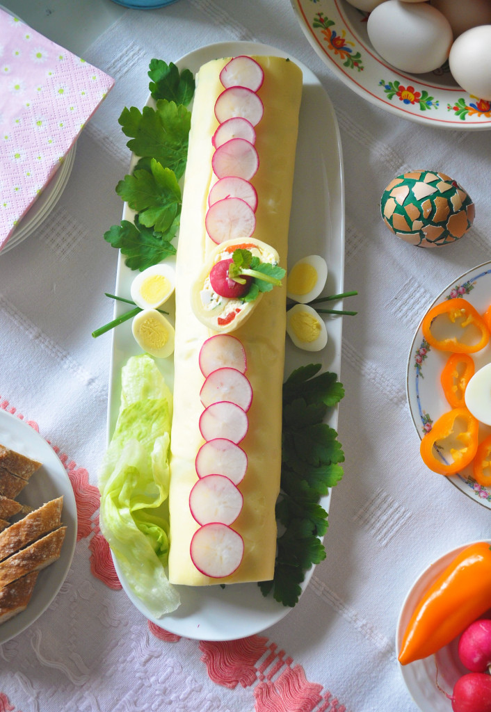 Ve větším hrnci přiveďte vodu k varu. Jakmile voda vře, vložte do ní sýr dobře uzavřený v sáčku. Já vkládám kostku sýru do dvou igelitových sáčků a každý z nich dobře uzavřu. Vařte ve vodě 30 minut. Mezitím si připravte náplň. V míse kuchyňského robotu KitchenAid si nejdříve vyšlehejte sýr s máslem. Poté přidejte nakrájenou zeleninu, vejce a bylinky. Podle potřeby dochuťte. Připravte si podložku, na které budete sýr válet. Doporučuji plastovou. Povrch zlehka pokapte teplou vodou a položte potravinovou fólii (díky vodě nebude po desce klouzat). Uvařený sýr vyjměte z vody, roztrhněte sáček a vyklopte na podložku s fólií. Začněte ihned válet - váleček si rovněž namočte. Na vyválený plát pak naneste rovnoměrně náplň. Zatočte, zabalte do fólie a uložte na chladné místo, kde ztuhne. Roládu pak nechejte v lednici odpočívat, ideálně přes noc. Pak už jen nakrájejte, ozdobte a můžete konzumovat.
