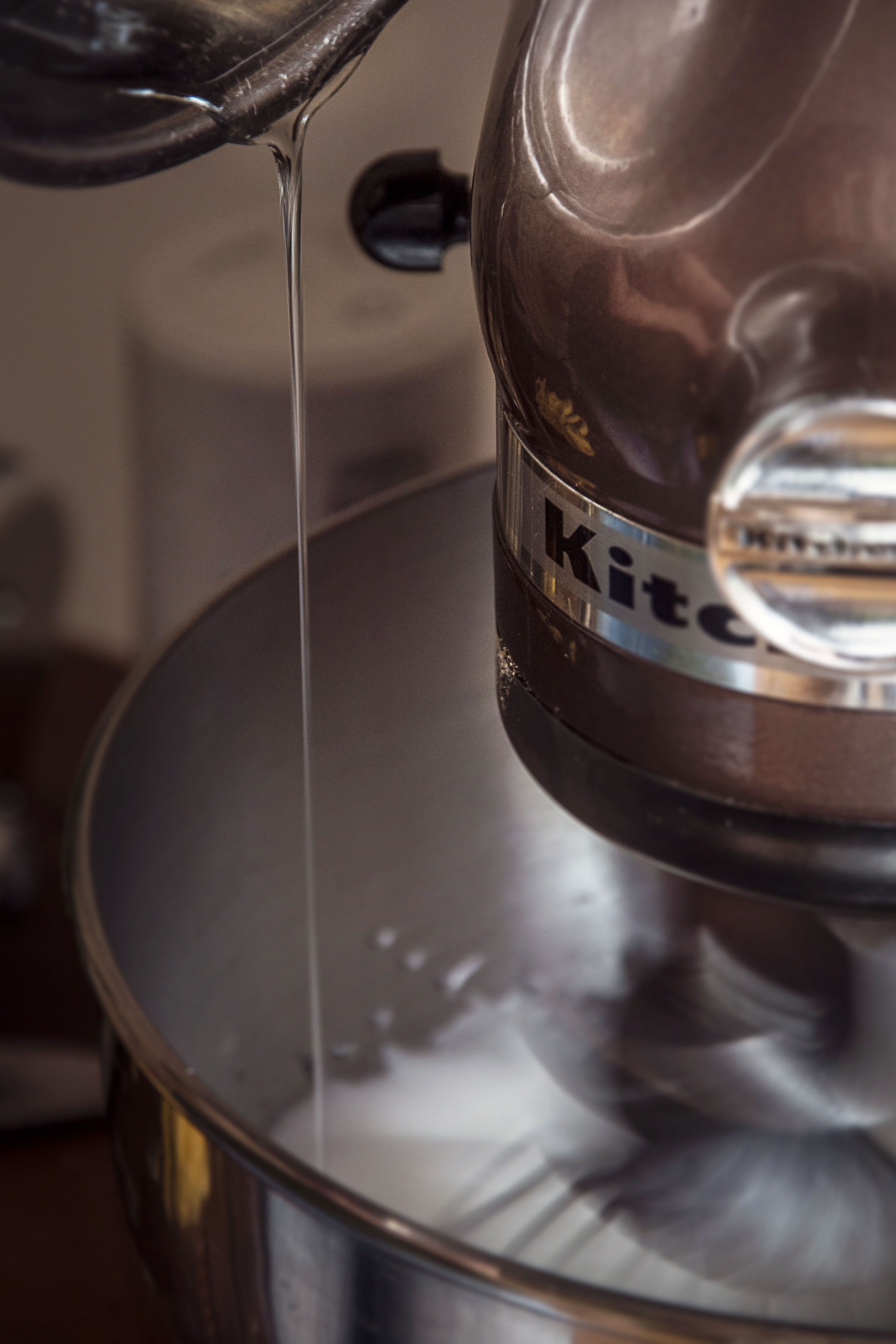 Do menšího rendlíku nalijte vodu a přisypejte cukr. Na středním ohni zahřívejte do konzistence sirupu tak, aby měl teplotu 115°C. Mezitím do mísy kuchyňského robotu KitchenAid nalijte odleželé bílky, přidejte špetku sody a šlehejte na střední stupeň balónovou metlou nebo ručním mixérem. Až budou bílky světlé a budou tvořit lehké špičky, začněte přilévat horký sirup. Přilévejte za stálého šlehání tenkým pramínkem. Poté zvyšte stupeň šlehání na maximum a šlehejte, dokud není mísa studená na dotek. Bude to trvat asi 10 minut. Ke konci šlehání přidejte vanilkové aroma.