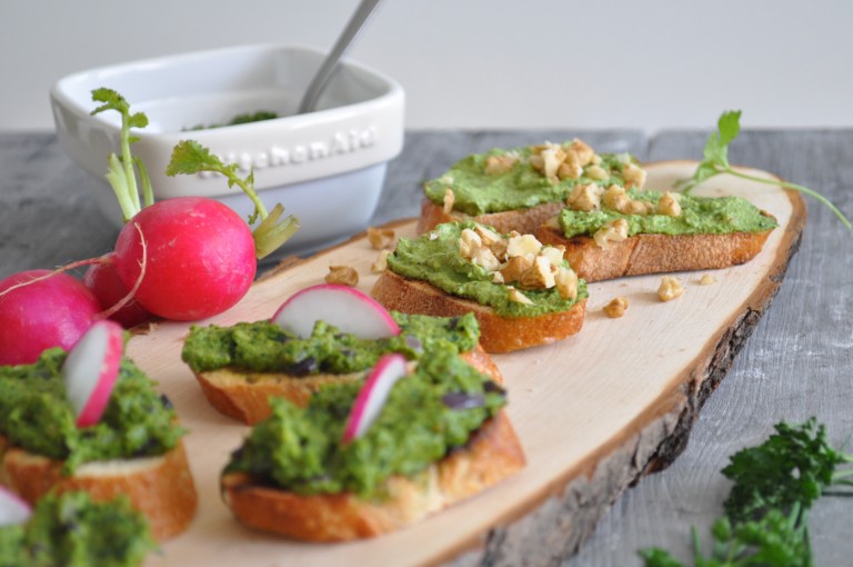 Bagety si opečte do zlatova, ide to aj v rúre. Ja som opekala na liatinovej panvici, bez oleja. Do mixéru dajte špenát, očistený cesnak, orechy, asi 3 lyžice oleja, 3 lyžice vody. Rozmixujte na redšiu pomazánku. Na oleji orestujte cibuľku, pridajte k nej špenátovú zmes a asi 3 minúty varte. Na opečenú bagetu dajte pomazánku a podávajte ozdobené a obložené čerstvou zeleninou. Takto pripravený špenát je výborný aj na cestoviny.