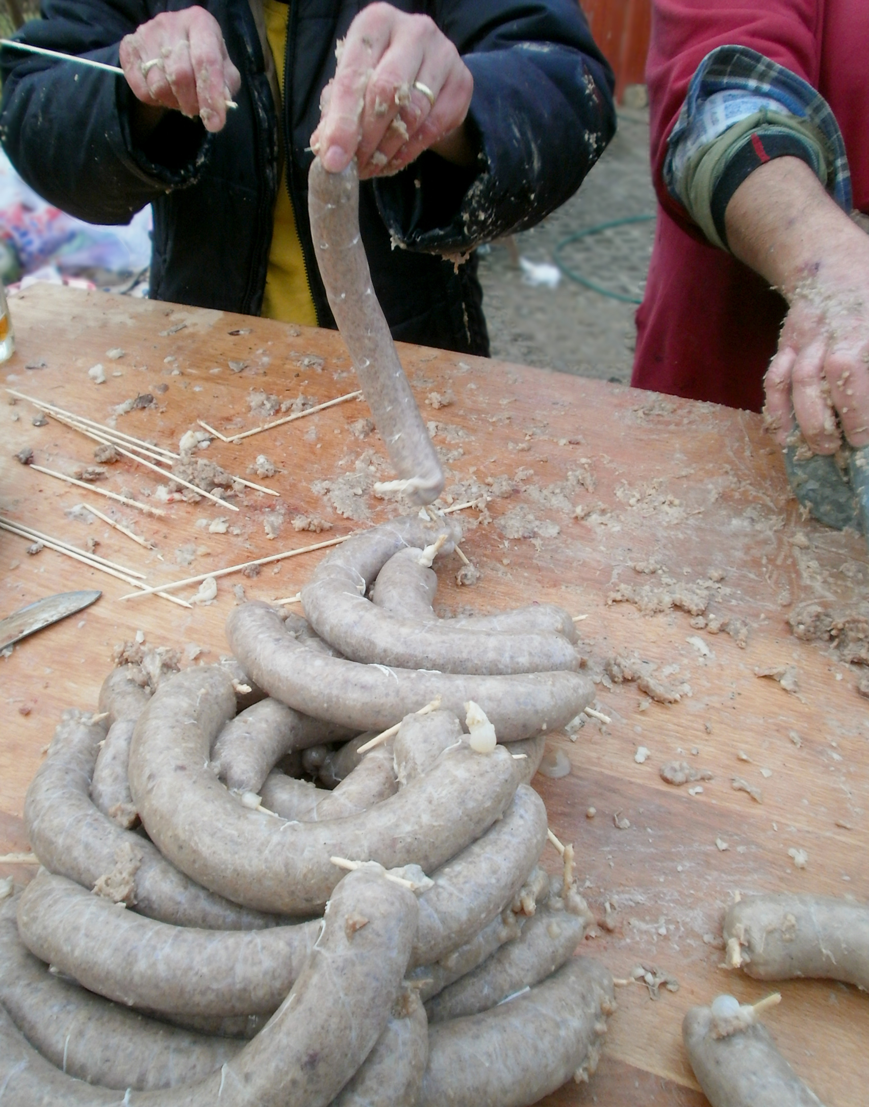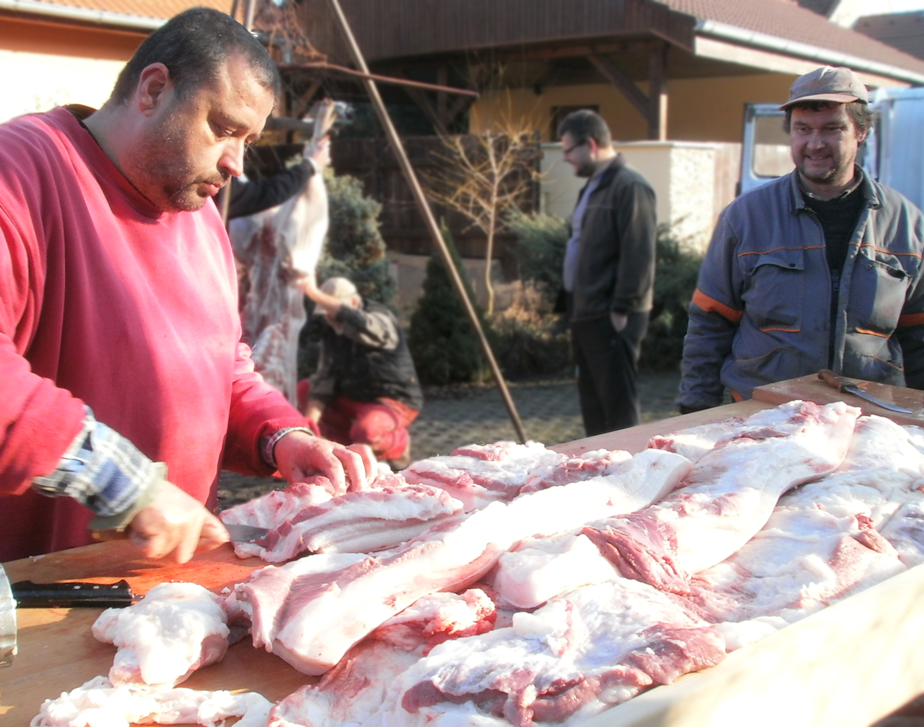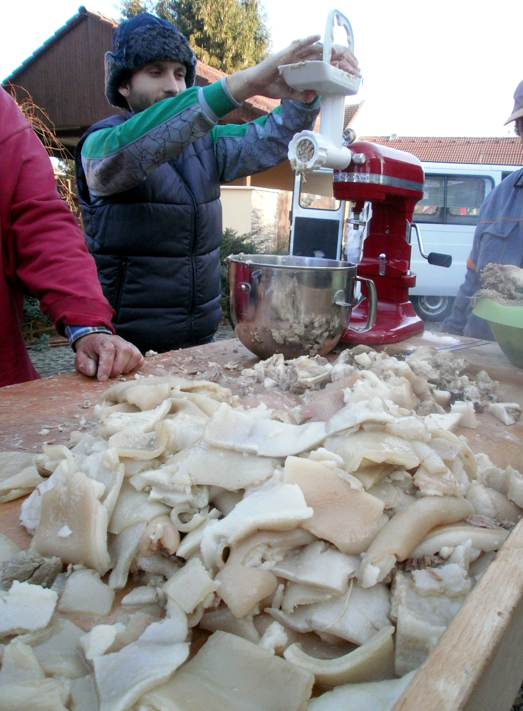 Začalo se tradičním způsobem - v půl osmé ráno kávou, bábovkou a krátkým vysvětlením, o co půjde. Poté se na místo dostavil vyhlášený místní řezník, který vykonal vše potřebné ...