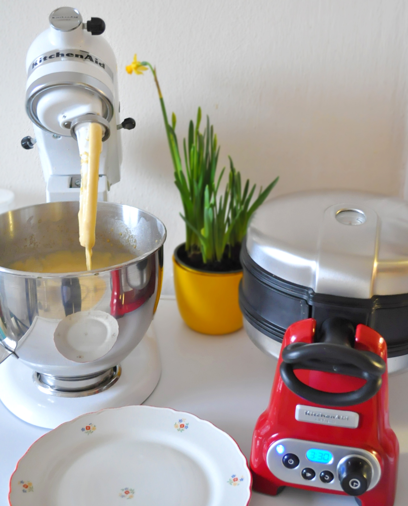Takto vzniklý základ těsta pak nechejte asi 30 minut odpočívat. Po uplynutí půl hodiny přilijte máslo a šlehejte asi 30 sekund. Mezitím si předehřejte vaflovač KitchenAid a postupujte podle návodu přiloženého k přístroji.