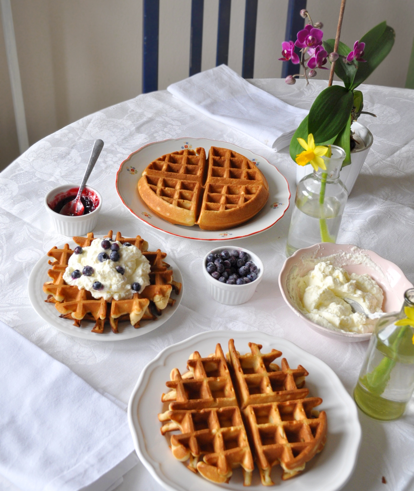 Hotové vafle jsme ozdobili šlehačkou a mraženými borůvkami :-)