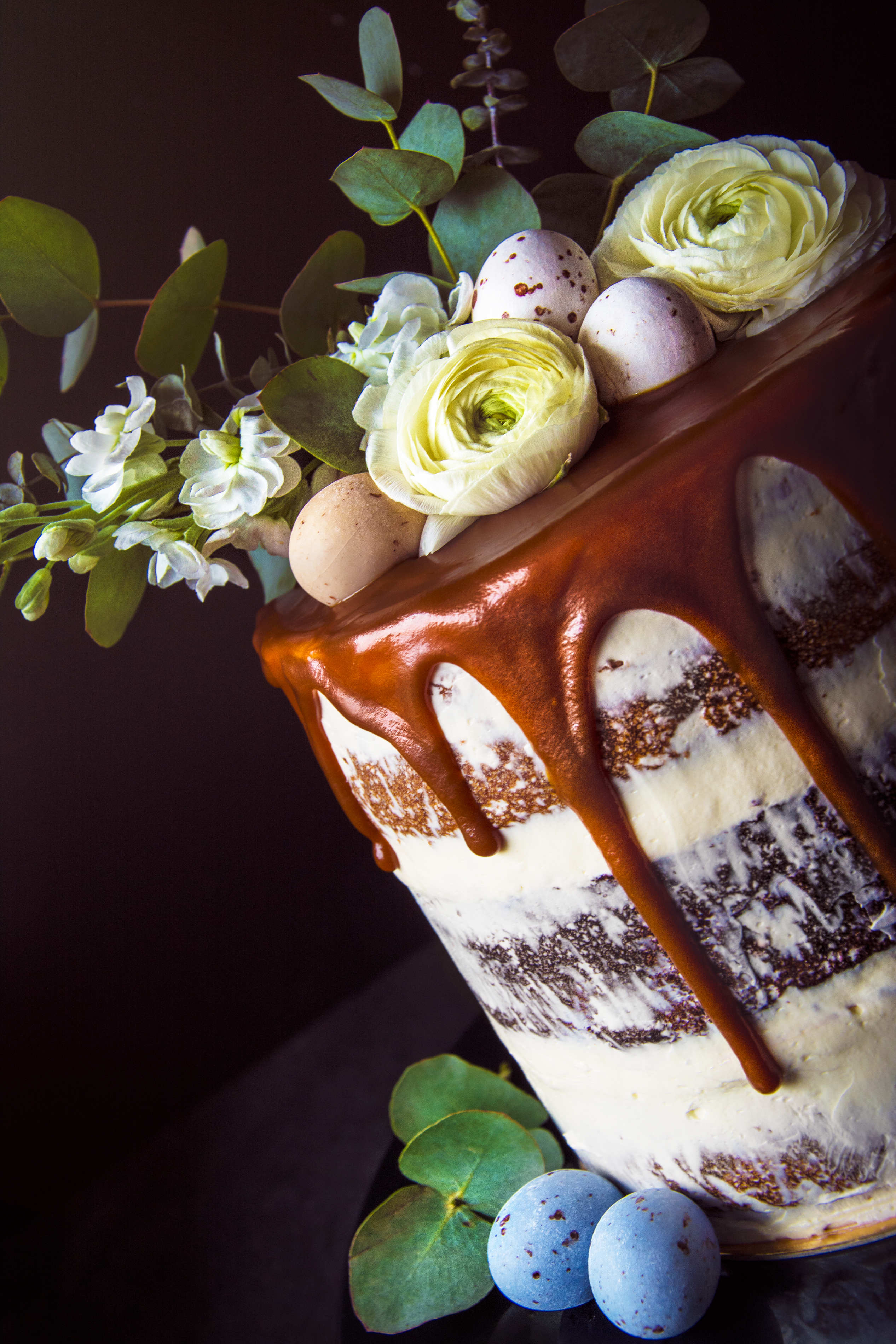 Korpusy podélně rozřízněte (případné vypouklé vršky seřízněte do rovna) a promažte postupně krémem. Každý korpus můžete pomazat i karamelem, ale není to nutné. Nakonec dort zahlaďte kolem dokola a dejte ztuhnout do lednice. Po 30 minutách ho přelijte karamelem, poklaďte vejci, květinami a máte hotovo!