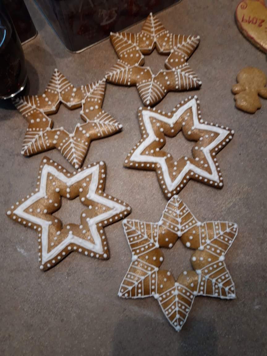 Všechny suroviny vložíme do mísy kuchyňského robota KitchenAid s plochým šlehačem, případně vypracujeme těsto po vzoru našich babiček pěkně ručně tak, aby bylo pěkně hladké. Hotové těsto vložíme do igelitu a necháme v lednici odležet alespoň do druhého dne. Můžeme ponechat i 2 - 3 dny, neboť koření a cukr tak bude mít možnost se krásně v těstě rozložit. Uležené těsto rozválíme na tenký plát, vykrájíme tvary a dáme péct na 190 - 200°C. Ještě teplé perníčky potřeme rozšlehaným žloutkem s kapkou mléka, aby byly krásně lesklé (nepotírat bílkem). Pak již necháme děti perníčky dozdobit dle jejich fantazie, zatím co my po takovém výkonu odpočíváme. A aby perníčky vydržely alespoň na druhý den, tak rychle uschováme někam na bezpečné místo.