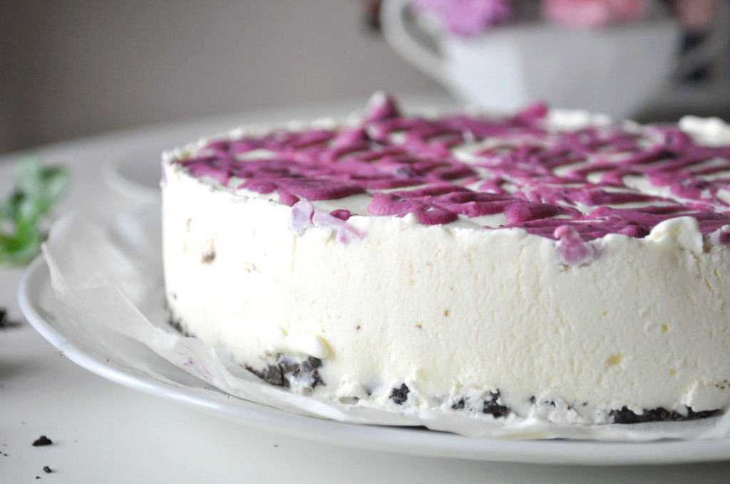 Zmrzlinu pak navrstvěte na ztuhlý korpus ve formě a následně opět vložte do mrazáku (alespoň na 3 hodiny, aby dort dostatečně ztuhl). Na ozdobení jsem použila borůvkový jogurt, kterým jsem hotový dortík polila a následně nechala ještě chvíli ztuhnout v mrazáku.