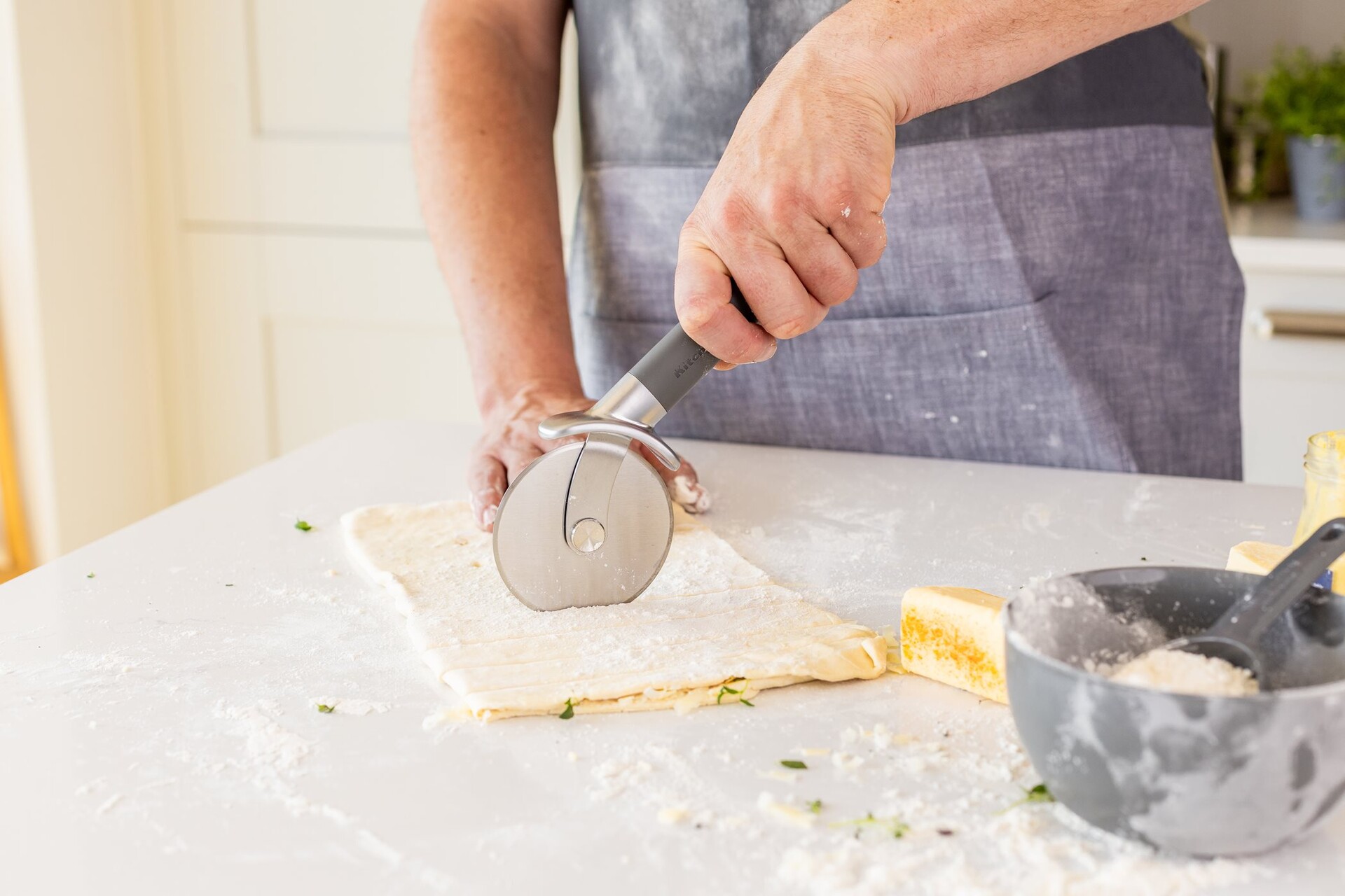 Robustní řezací čepel z nerezové oceli, která snadno prořízne i tu nejtlustší pizzu a je nakloněna tak, aby poskytovala optimální pohodlí a výkon.