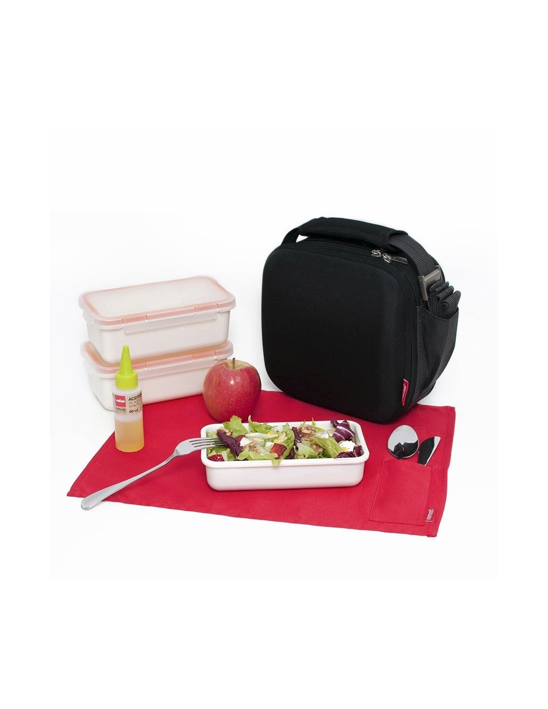 Pevná potravinová taška na oběd s tvrdými stěnami a moderním designem. Vnitřní izolace z pokoveného textilu, který je neabsorpční a velmi snadno se čistí. Oboustranné otevírání umožňuje lepší přístup a čištění. Praktická vnitřní síťka pro uložení příborů. Rozšiřitelný pásek pro nošení přes rameno a polstrovaná rukojeť.